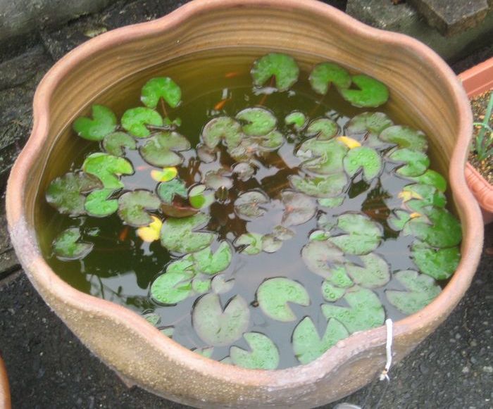 成魚を入れた大きな焼き物の鉢。左のはかなり大きく、緋色メダカが優雅に泳いでいる。