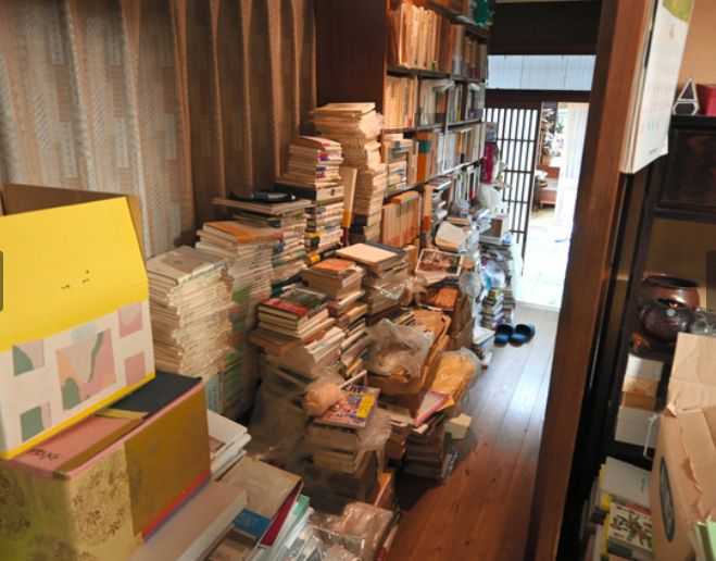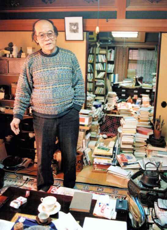 生前の前登志夫(1995年の12月ごろ)。 本や雑誌で埋め尽くされている。