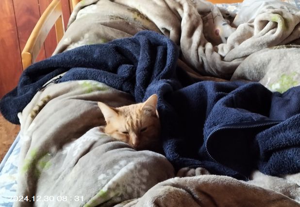 私が起きてしまった後もそのままベッドに寝ている。たまにそういう日がある。たいがいPCの前にいる私の膝の上に乗って来るのだが、今朝も寒いのでぬくぬくしていたいのだろう。