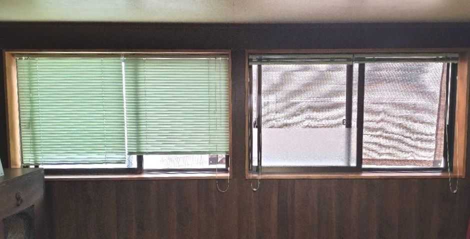 ブラインドは、風を入れるため少し上げてあり、その部分は丸見えになっている。シェードの張ってある方はそれも解決できている。