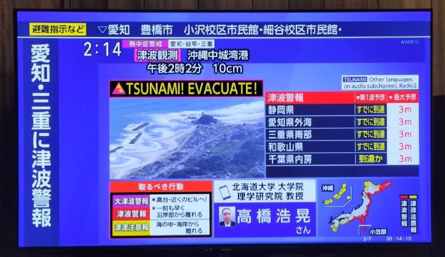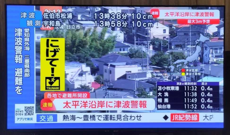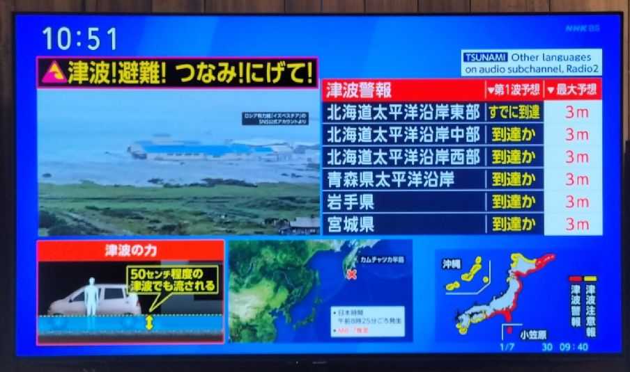 9時半ごろの津波警報には驚いた。防災無線、防災ラジオから警報音が流れ、観ていたMLBの放送は中断。TVは津波情報一色になった。