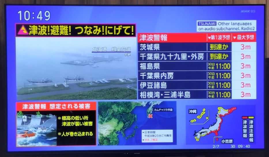 午前8時25分ごろのカムチャツカ半島付近を震源とする地震の影響で、北海道太平洋沿岸西部、千葉県内房、伊豆諸島、相模湾・三浦半島、愛知県外海に津波警報が出され、現在も継続中。