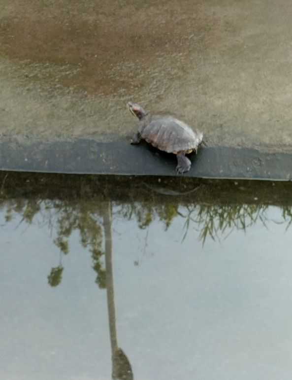 干潮で水位が下がっている。ミシシッピーアカミミガメ