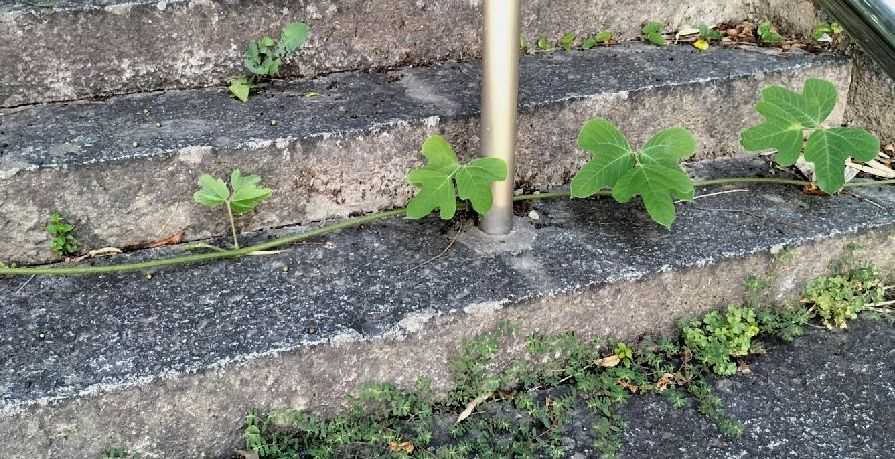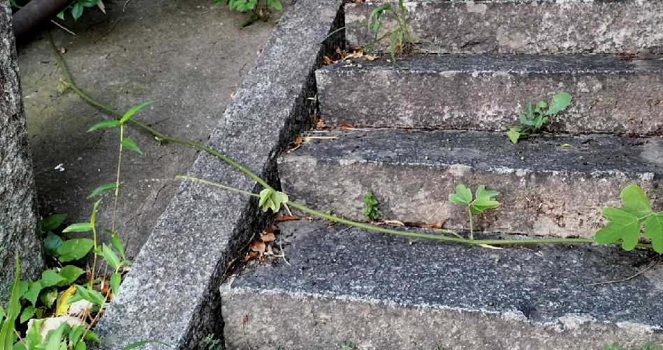 駆け上がった秋葉神社の階段。右から左へ横断する葛の蔦。