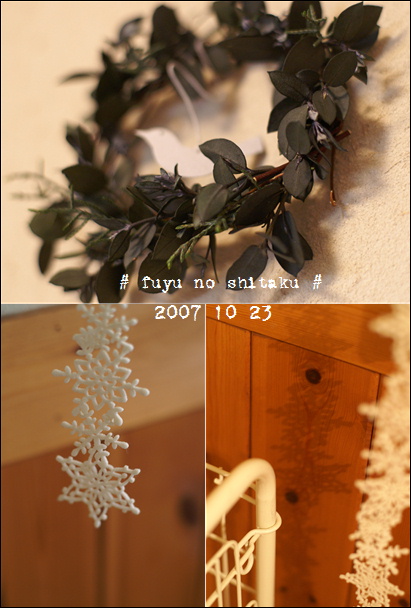 ストーブも長袖もブーツもだして寒さ対策万全。 さあ来い!北風ウェルカム! でもね。あんまり寒くない。 夜も布団いらず。相変わらず家の中では半袖短パンな我が家。 気分だけは冬なんですけど・・・・・・。 近所の雑貨屋で買った雪の結晶模様のこれ。 照明で出る陰も美しい~。 もうちょっとしたらブッタ切って クリスマスツリーにぶら下げ予定。うしし。 夫の留守中。私的にはかなり思い切って壁にブスリ。 ogaちゃんのリースを飾ったのです。 ・・・・でもやっぱり怒られたく無いから 画鋲より細いマチバリです。 リビングの壁、わらを混ぜた珪藻土です。 漆喰よりもカジュアルで汚れも目立たず コテむらを付けなくてもおしゃれな仕上がり。 臭いを吸い、湿度も調節。 ・・・・すばらしいでしょ?