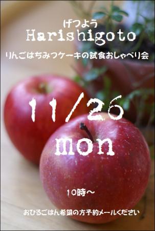 Harishigotoの日、ちょいちょい売ってる エッチャンバーバの“りんごハチミツケーキ”ご存知でしょうか? まとめて買って帰る方も多い人気ものなんです。 Harishigotoの日、 髪振り乱してレジにかかりっきりの私たちテンパリ姉妹。 せっかく来てくれるみなさんとお話出来ずじまい。 そのおしゃれブーツはどこで売っているのか? かわいい服は手作りなのか? 私にも作ってはくれないか?・・などなど 話したいことは山盛り。おしゃべりな私、話せないことがストレス。 そのモヤモヤを晴らすべく、 ケーキの試食がてら遊びに来てください。 人気のハチミツも販売予定です。 今年の分はこれでおしまい。ケーキにもタップリンコ入ってます。 お昼ご飯希望の方は事前にご予約ください。 こちらでやんす→ ☆ では 11・26 月曜日 10時ころから 喋る気満々でお待ちしています。 駐車スペースが限られています。乗り合わせ熱望。