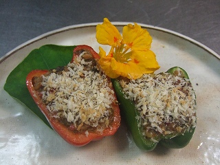もう秋だというのに最近手にすることが多い「ピーマン」。夏野菜はすでに終わりに近づいていますが養生園の畑は今ピーマンが豊作。ピーマンはビタミンCやビタミンA、カロテンが豊富なため風邪予防や夏の疲れた肌の回復に効果的。動脈硬化や高血圧予防にも威力を発揮します。中でも赤ピーマンは最も栄養価が高くビタミンCはレモンの2倍。ピーマンってそんなに栄養あったのね。今では好き嫌いなく畑で収穫できたものは全て料理させて頂いております、はい。で、最近のお気に入りのピーマン料理レパートリー。第一弾は「肉詰め風焼きもの」手元にある野菜をみじん切りにし(今回は玉ねぎやパプリカ、長ねぎなど)同じくみじん切りにした干し椎茸の軸も一緒によく炒め味噌で味付けをして生姜醤油で下味をつけた乾燥の大豆タンパクを合わせピーマンの中につめました。フライパンで焼いた後にドライハーブ入りのパン粉をつけて焼きめをつけ今が満開のナスタチウムの花を飾り、出来上がり。「チンジャオロースー風炒めもの」。緑と赤ピーマン、同じく下味をつけた切り板麩と一緒に炒めました。切り板麩は下味をつけた後に葛粉をつけて素揚げ。酵素玄米にも発芽玄米のお粥にも合う一品です。これは「ぶなしめじとピーマンのおひたし」。しょうゆを入れただしにしっかり火を通したしめじと蒸したピーマンをひたして味を染み込ませて盛り付けます。今朝の朝食の一品。ピーマンっておひたしにしても美味しいんだ。新しい発見。みなさんも是非一度試てみて下さい。養生園に初めて来た時一番の感動は野菜が甘くて美味しかったこと。人参も大根もごぼうもそれぞれの味と甘みがしかっりでていてのどを通っていく度にカラダが喜んでいくのがわかりました。ピーマン含め野菜ってこんなに美味しかったんだ、と改めて実感。ささやかながらこの感動を日々のゲストの方々とそして大切なスタッフのみんなと共有していけたらこんなにしあわせなことはありません。穂高はすっかり秋景色。田んぼは黄金色に染まり新米の収穫ももうすぐです。実りの秋が到来。隣村のリンゴ農園さんから初物のりんごが届きました。次回はりんごのデザートをアップします。お楽しみに~!明日も皆さんにとって良い日でありますように。大地の恵みに感謝‥!