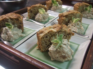皆さん、中島デコさんをご存知ですか。マクロビオティック料理スクールの人気講師、数々の料理本も大人気。そんなデコさんがなんと今養生園に‥。昨日からデコさんのワークショップが始まりました。食に関心のある多数のゲストが集まりデコさんを囲んで楽しいお料理教室。軽快なトークに惹きこまれてあっという間の時間。これまでは本だけでしか知らなかったデコさんが実際に目の前で料理して解説してくれるなんて‥私は幸せものです。今日は養生園の新館「森のうち」の屋外キッチンでお料理教室。朝から気持ちのいい秋晴れ。青空のもとで風を感じながらの料理作りは最高です。 左奥から「蓮根と切り干し大根の梅酢和え」「かぼちゃとさつま芋の酒粕クリームサラダ」「手作りコーフーカツ」薄切りにした蓮根をざっとゆでて水でもどさずに切干大根と一緒に薄めた梅酢に漬け込んだらあ~らもう出来上がり‥のお手軽レシピ。かぼちゃとさつま芋のサラダは今回持参して頂いた美味しい酒粕と豆乳、麦味噌、タヒニとオリーブオイルで作るドレッシングで和えもの。酒粕の香りが味噌と合って美味しい一品でした。主食は「甘栗と古代米の玄米ご飯」 黒米や赤米、緑米にたっぷりの栗を入れて炊き込みました。ほくほくした栗の甘みが秋を感じます。夕暮れ時のひんやりした風と渓流の音を聞きながらベランダでみんなで試食兼夕食。至福のひととき。う~ん、幸せ。と、ふと見るとデコさんの姿がない。キッチンに様子を見に行くとなにやら切り分けている姿が‥。 デザートですね。 こんなにゴージャスになりました。「桃とひえのケーキ」。りんごジュースで炊いたひえを型におしこみその上に桃をのせて寒天でかため、豆腐とポンセンで作ったクリームをトッピング。採ってきたミントを飾って出来上がり。はい、もちろんしっかりと堪能しました。気負わずにまずは楽しく作って美味しく食べよう、というデコさんの気さくな人柄のおかげでワークは終始和やかな雰囲気につつまれ参加者の皆さんも意欲的に楽しんでもらっている感じ。引き続き明日のクラスも楽しみです。夜の講義で聞いた言葉が心に残っています。自分の中が空っぽになればそこに運命の流れや宇宙の気が入ってくる‥。うん、そうだよなぁ。空っぽとまではいかないまでも新しいものがすっと入ってくるくらいの隙間を作りたい。入れることも大事だけれど同時に出すことも同じくらい大事。作ること、味わうことを楽しみながらそんなことを感じた一日でした。明日も皆さんにとって良い日でありますように。大地の恵みに感謝‥!