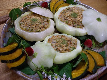 畑をやっている近くの友人から頂いたお野菜たち。大根やかぶの間引き菜、人参、おくら、しその穂。中でも一番の活躍はズッキーニ。フツーはきゅうりをちょっと大きくした形だけれどもらったのはまるで漫画に出てきそうな、平べったいUFOの形をしたやつ。こんなの初めて見るよ~!ちょっと季節外れだけど、まっいいっか。だってとてもかわいいんだもん。早速今日の夕食に登場です。「UFOズッキーニのたっぷり野菜詰め」。中をくり抜いて軽く蒸したズッキーニに人参や玉ねぎ、干し椎茸のみじん切りをよく炒めたっぷり詰めこみました。養生園畑で最後の収穫となったピーマンも。塩をふって炒めて甘みを引き出した後炊いておいたオートミールを混ぜ合わせ細かく切ったセイタンを入れてひき肉風に。味噌で風味をだして出来上がり。つめて大皿に盛り付けたらこんなゴージャスに変身!庭の花や葉っぱでスタッフが飾りつけオーブンで焼いたかぼちゃを添えました。いつもは切り分けて盛り付けですが今日はこの大皿のまま、ゲストの目の前に…。もちろんみんな大喜び。自由に切り分けて食べてもらいました。もちろんズッキーニは皮ごとイケちゃいます。ちょっとだけパーティ風。目先が変わってたまにはこんなのも楽しくて良かったです。明日もまた素晴らしい一日になりますように。大地の恵みに感謝…!