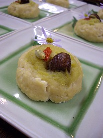 栗を忘れちゃいけませんよね。前回のブログに補充です。栗とさつま芋を使った秋のデザート。一昨日の夕食より。「さつま芋と栗の蒸しケーキ風」。乱切りにして塩を少々ふってざっと炒めりんごジュースで煮たさつま芋。水でもOK。マッシュして豆乳を入れてのばして柔らかなさつま芋クリームに変身。油が入るとさらに甘さが増します。水切りしたお豆腐をマッシュし白胡麻ペースト、葛と地粉を混ぜ合わせお団子にしておいたさつま芋クリームを包みくこの実と栗をトッピング。蒸し器で蒸すこと約10分。ほかほかのデザートの出来上がり。番茶にぴったりな優しい味です。ちなみにその日の夕食はこんな感じ。これに酵素玄米がつきます。手前の汁物は「玄米粉のホワイトシチュー風」。今ホールでは暖炉に赤々と炎がともっています。こんな寒い夕べにはシチューがぴったり。この日はかぶと玉ねぎをたっぷり入れて甘みを出しました。もみじ型の人参とブロッコリーを添えて。中央の青いお皿は車麩のソテーと野菜の盛り合わせ。ネギの根っこの素揚げや春菊のおひたし、紫玉ねぎとぶなしめじのオーブン焼きなど盛りだくさん。黄色のものはもちきびを炊いてクリームにしたもの。粗く刻んだ高野豆腐をひき肉風の具にして味噌でじっくり煮込んだトマトソースを添えました。もう今年最後のトマトソース。秋の食材はこれから旬を迎え養生園の食卓もさらににぎやかになります。どうぞお楽しみに…。明日もまた素晴らしい一日になりますように。大地の恵みに感謝…!