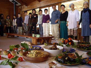 昨日で無事に全て終えることができました。ホッと一段落。気分はめっきり晩秋。最後の祝いの食事では出来上がった嬉しさと一緒にもうこれで終わるんだという寂しさもあり一つの区切りを実感しました。例年にも増して強力なスタッフ陣。完成度の高い料理ができて嬉しさもひとしおです。パーティ風料理ということで今回大活躍したのがこの黒米ロール。 玄米に黒米を入れて炊き上がったご飯に梅酢とゆず果汁で巣飯にしたものを生春巻きの皮で巻きました。一昨年、中島デコさん宅で何回も食べた一品。今回の中身は得意のごぼう料理のひとつバルサミコ酢醤油からめと人参千切りがたっぷり。初回は春菊のおひたし、二回目は水菜を入れて巻いてます。透明の生春巻きの皮に黒米が透けて見えてきれい。黒米は普段の養生園ご飯でも頻繁に登場。もちもちしていて美味しいし不足しがちなミネラル、ビタミンが豊富。この黒い色素が造血を促進してくれます。梅の酸味をきかせてサラダ感覚に。ぱくぱくっといくつでも食べられちゃう。そして隠れた名脇役、ひじきと根菜のマリネ。蕪や人参がたっぷり。炒ってすった白ごまと麻の実も入って香ばしい。柑橘系の酸味ともよく合います。これもたくさんおかわりのあった一品。メイン料理の合間の箸休め。そして汁物はマリリンの大好物のとうもろこしとひよこ豆のポタージュスープ。野菜と豆の甘みをしっかり堪能。マリリンが楽しみにしていると聞いてさらに張り切って作りました。スエットロッジ定番の味です。今年もまたスエットロッジを開催してくれたマリリン、ありがとう!おかげでたくさんのゲストが素晴らしい体験をすることができました。もちろん私たちスタッフも。手前からネイティブアメリカンのマリリン・ヤングバード通訳の孝江さん、アシスタントのキャサリン。たくさんの愛と感謝の気持ちをおくります。全ての出会いは宝ですね。来年もまたみんなで待ってます。明日もまた素晴らしい一日になりますように。大地の恵みに感謝…!