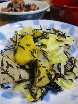 皆さん、お待たせしました。おうちご飯ひじきシリーズの第二弾です。前回同様にあらかじめ煮ておいた芽ひじきを使うお手軽バージョン。一品目はこれです。「温野菜のひじき和え」。塩をふって蒸したキャベツ、さつま芋、大根に芽ひじきをざっくり和えました。たったこれだけ。簡単すぎてごめんなさいって感じ。でも美味しいよ。蒸し野菜はそれだけでも甘みが増して美味しいけれどひじきの旨味が加わるとさらに別の料理になります。海と大地の恵みが満載。簡単に一品、出来上がり。芽ひじきにしっかり醤油味をつけて煮ておけばこれで和えるだけで十分ですがもし少し物足りないようでしたら塩をふって調整してくださいね。二品目はこれ。「ひじき入り春雨の煮もの」。鍋にみじん切りの生姜とにんにく、ごま油を少々入れてふたをして弱火。その上にほぐした舞茸(なければ他のきのこ何でもOK)と長ネギを入れて煮ます。きのこから出てくる水分と焦げ付かない程度に入れるだし汁や水でOK。おおかた火が通ったらあらかじめ熱湯で茹でておいた春雨を入れてさらに煮ます。煮えたら塩少々ふって下味をつけ作りおきの芽ひじきを加えて全体をよく混ぜ合わせます。ごま油を少々加えると中華風。炒り胡麻をふって出来上がり。残り野菜何でもOK。でもネギは欠かせないかな。コクがあってご飯に合う一品です。そうそう、にんにくは乾燥にんにくが便利。ちょっとだけ使いたい時に袋から出して手で粉々にするだけ。生に比べたら香りは落ちるけれどおうちご飯ならこれで十分。ひじきバージョンから外れるけれどおまけの一品です。「さつま芋の胡麻味噌和え」。白ごまペーストと味噌(お好きなもので)をよく混ぜ合わせ豆乳(なければ出し汁か水)を少々加えてのばします。そして蒸したさつま芋を和えるだけ。胡麻の香ばしい味わいとほっくりとしたさつま芋の甘みがベストマッチ。イモ好きの私にはたまらない味。時々無性に食べたくなります。実は今晩も食べました。たまに私のおやつにもなります。あぁ、食べ過ぎないよう気をつけなきゃ。皆さんにとって明日も良い一日になりますように。大地の恵みに感謝…!