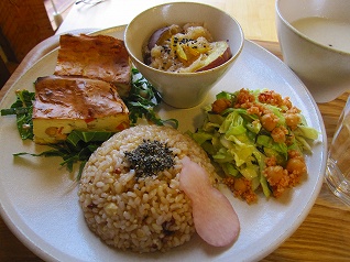 昨日の埼玉は氷雨。都内でも初雪。全国的にとても寒い一日でした。そんな寒さに負けず埼玉の郊外にお出掛け。行き先はマクロビオティック料理のカフェ。 頂いたランチはこちらです。手前は雑穀入り玄米ご飯。右はキャベツとひよこ豆のサラダ。左は豆腐のしっとりキッシュ。香辛料のクミン入り。なかなかインパクトのある一品でした。まわりのカリッとした食感もグッド。どれも美味しくて印象的。奥の器はさつま芋煮の大根おろし和え。添えられたゆず皮と共にさつま芋の甘さが引き立てられていました。冬大根は甘くて美味しい。胃の働きを促進し食べたものの消化を助けてくれる大根。大好きなさつま芋とも相性ぴったり。帰ってから私も作ってみようっと。外で食べるご飯は新鮮な発見でいっぱい。このカフェのオーナー夫婦は養生園のゲストでもあります。去年の夏に二人で泊まりに来てくれました。半年ぶりの再会。今度は埼玉で、しかも私がゲスト。懐かしくそして楽しいひととき。こんな景気の世の中だからこそこうして二人でコンセプトを守りながら日々笑顔で料理を提供し続けていることにとても心強いものを感じました。芯の強さと柔らかさ。どんなふうにバランスをとっていくか私の課題のひとつです。皆さんにとって明日も良い一日になりますように。大地の恵みに感謝…!