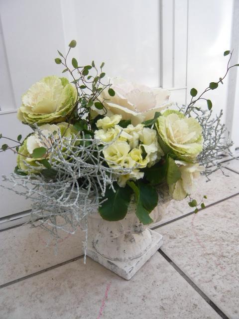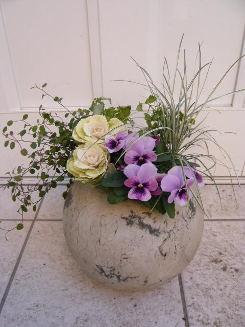 今日は少しずつお天気崩れてくるみたいですね朝はとってもキレイな青空だったのに今は雲で覆われていますそしてまた強い風…午後はでかけるので落ちそうな鉢は降ろしていった方がいいかな さて。一昨日作った寄せ植えですどうしてもハボタンのブーケみたいな寄せ植えが作りたくて…そう思ってたときにちょうどお友達のブログで見ていいなと思っていたハボタン 神戸ジェンヌを発見めっちゃカワイイ~去年までの私だったら絶対ハボタンに「カワイイ」なんて表現は使わなかったなぁ早速ブーケを想像して寄せ植えにしてみました かなり全体的に淡いトーンでまとめて鉢もブーケらしく見えるようにスタンドタイプのモノを使いました上から見るとこんなカンジ ほんとハボタンってお花みたいこうやって見るとどれがハボタンで、どれがプリムラかわかんない、かも(笑そして、いちお主役のつもりの右上のハボタンこれが神戸ジェンヌやっぱ違うよね~バラみたい 他のハボタンとは別格ってカンジんー実物の方がもっともっとキレイなんだけどなぁ色も真っ白で全然キャベツっぽくない(笑というかもうキャベツなんて言わせない タイガーアイもどきコクリュウと植えてありますだいぶ花数が増えてきましたヨやっぱこの子は単植にして正解でしたタイガーアイもどき、名ナシの98円で買ったのだけれど、もっと買っておけばよかったかな…あれ以来見かけなくなっちゃいました気に入った子を大人買いするのはクセですね ランキングに参加しています一日一回ぽちっと応援クリックしてもらえると嬉しいですコメントも気軽に残してくださいね