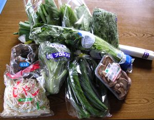 1週間に一度買い出しに行きます。近所のスーパー、野菜が安く買えて、もう他では買えませんきゅうり1袋 100円長ネギ1束 98円ほうれん草 78円春菊 55円チンゲン菜 29円ブロッコリー 88円糸三つ葉 10円里芋1袋 100円と、こんな感じです。もちろん、すべて国産です。