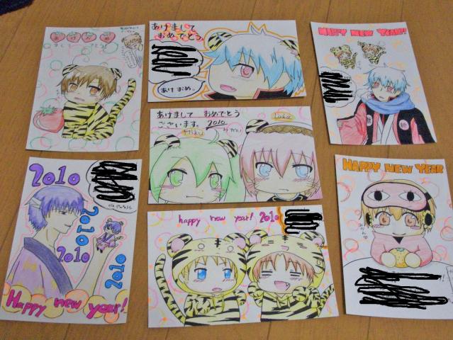 年賀状企画って言うのをやってみたいと思います!!初めましてな方もOKなので、是非募集してくださいまずは注意事項とかw・誰でも応募が出来ます!日本国内宛なら、どなたでも構いません。・キャラクターは VOCALOID(初音ミク、鏡音リンしか描けないorz) ヘタリア(ちびちゃんずが描きやすいw でもとりあえずは何でも描ける? にょたりあ、しょたりあもおk!) 銀魂(何でもあり) ポケモン(擬人化、そのまんまどっちでもありです。) キャラクターの人数は1人(匹)~3人(匹)ぐらい描きます(特別な場合は除く) この中にはないキャラクターももしかしたら描けるものがあるかもしれませんので その場合はその他のところにに書いてください。・キャラクター人数の相談についても、その他のところに書いてください。・御一人様原則一枚となります。・年賀状の交換は大歓迎です!その場合もその他のところに書いて下さい。 ・〆切は12月11日(金)までです。場合により早まることがあります。そのときはご了承ください。 ・参加資格 小学校高学年以上の方(男女問いません) 個人情報を悪用しない方、ある程度のマナーが分かる方と、いうことで☆参加方法説明★↓↓↓↓↓必要事項記入して↑のところで応募してください※コピー&ペーストが望ましいですが、必要事項を明記して下さればOKです。1.郵便番号(正確にね!)2.御住所(都道府県名から)3.御氏名(PN及びHN不可)4.御氏名のフリガナ (万が一の場合、問い合わせをする際に間違わない為です)5.H.N.又はP.N.(有れば)6.描いてほしいキャラクターの番号7.その他そして、僕からの返信メールが届いた時点で受付完了。返信は遅くても5日で届くと思います。但し、稀に届かない場合が有ります。その際はお手数ですが、再度、送信して頂くか、ブログの方へコメントを付けて下さると幸いです。勿論、頂いた住所を悪用したりは絶対に致しません!ので、御安心下さい。質問などはコメントでください!