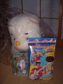 頼んだのは、10月の下旬。心配になり、11月の下旬に電話したところ。恐縮されて 「発送が間に合わないんですよ。」とおっしゃっていたので、気長に待ってました。来ましたよー。クリスマスに。大きなダンボールにて。でも、運送会社がダンボールを破損させちゃったので中身を確かめさせて欲しい!!って言うもんだから、私が開けることは出来ず、他人さんが開けちゃって・・・。楽しみ半減ですよー。気をとりなおして、爆笑編から紹介しまーす。白いぬいぐるみ、謎です。あと、かなーり古い戦隊物の凧と、今話題のレッドソックス 松坂の魂が注入されているスピードガンつきボールです。次は、息子達お気に入り編I-DOG と ピヨピヨ (ひよこがしゃべるようです。なぜか長男が気にいってます。使えるかどうか不明。)パパ 仕方なく編大量の品物をみて、「俺のはー?」「ないよー。」と言うと。「じゃあ、車でいいや。飾ろう。」と言っておりました。最後に、私には渋すぎるので、日頃の感謝をこめておばあちゃん行き決定編お財布はない!!と言われたんですが、だめもとでメールに書いたら探して下さったようで、でも、買っちゃった後だったので・・・。ばあちゃん行きです。18金ネックレスも渋いので・・・。バッグもブランド品らしいんですが、知りません・・・。すべて、おばあちゃん行きです。私としては、☆3つかなー。だって、私の分がないんですよー。でも、家族が楽しめたからいいかなー。金額的には、財布はミラショーンだし、18金ネックレスだし、結構お得でした。何より、ショップさんの心遣いがうれしかったです。