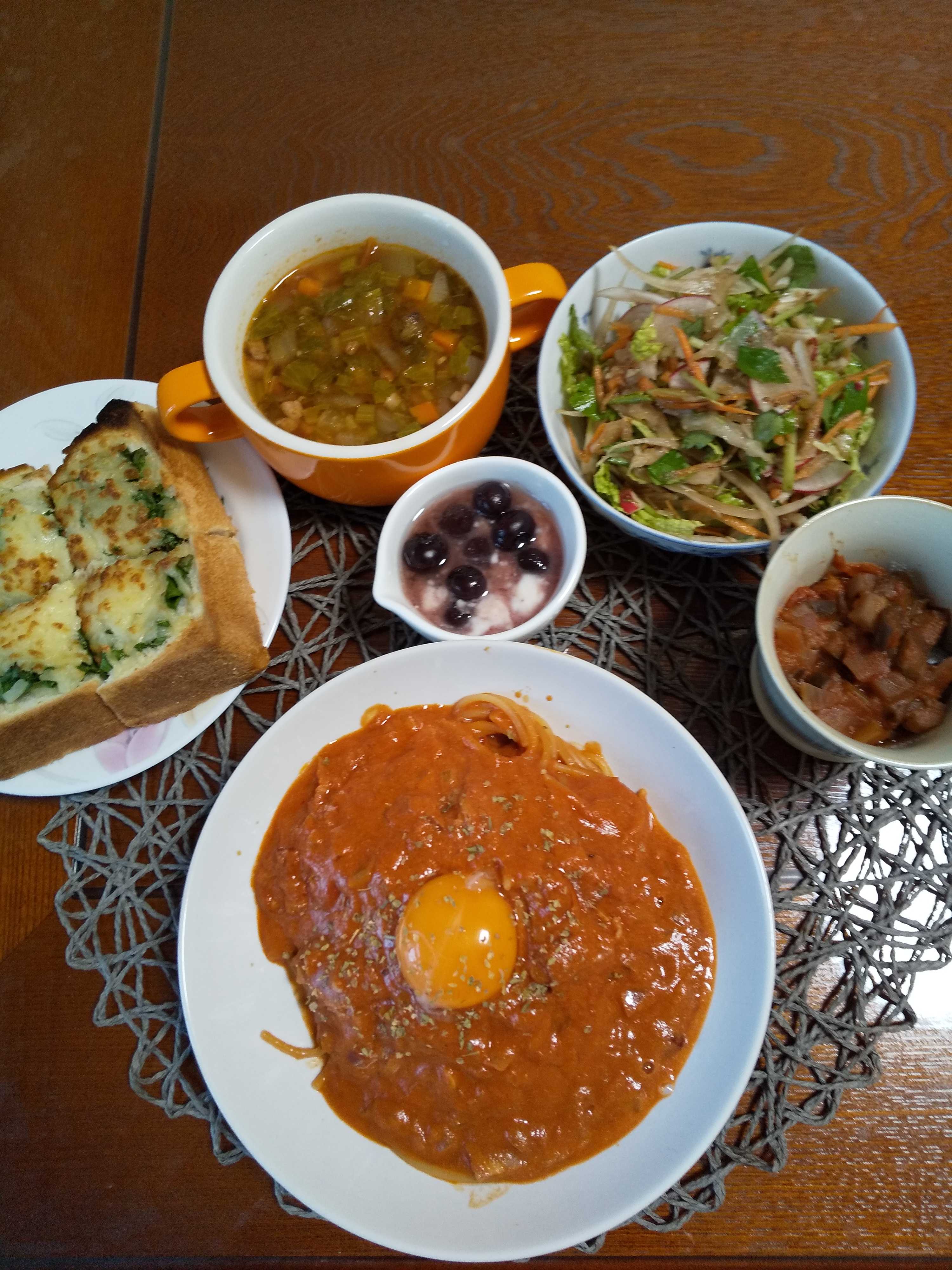 今日の夕飯です。 「五右衛門風カルボナーラチリトマト」を作りました。 五右衛門風カルボナーラチリトマト 茄子のカポナータ 野菜サラダ ケールのへコパン ブルーベリーヨーグルト 実沢山チリスープ