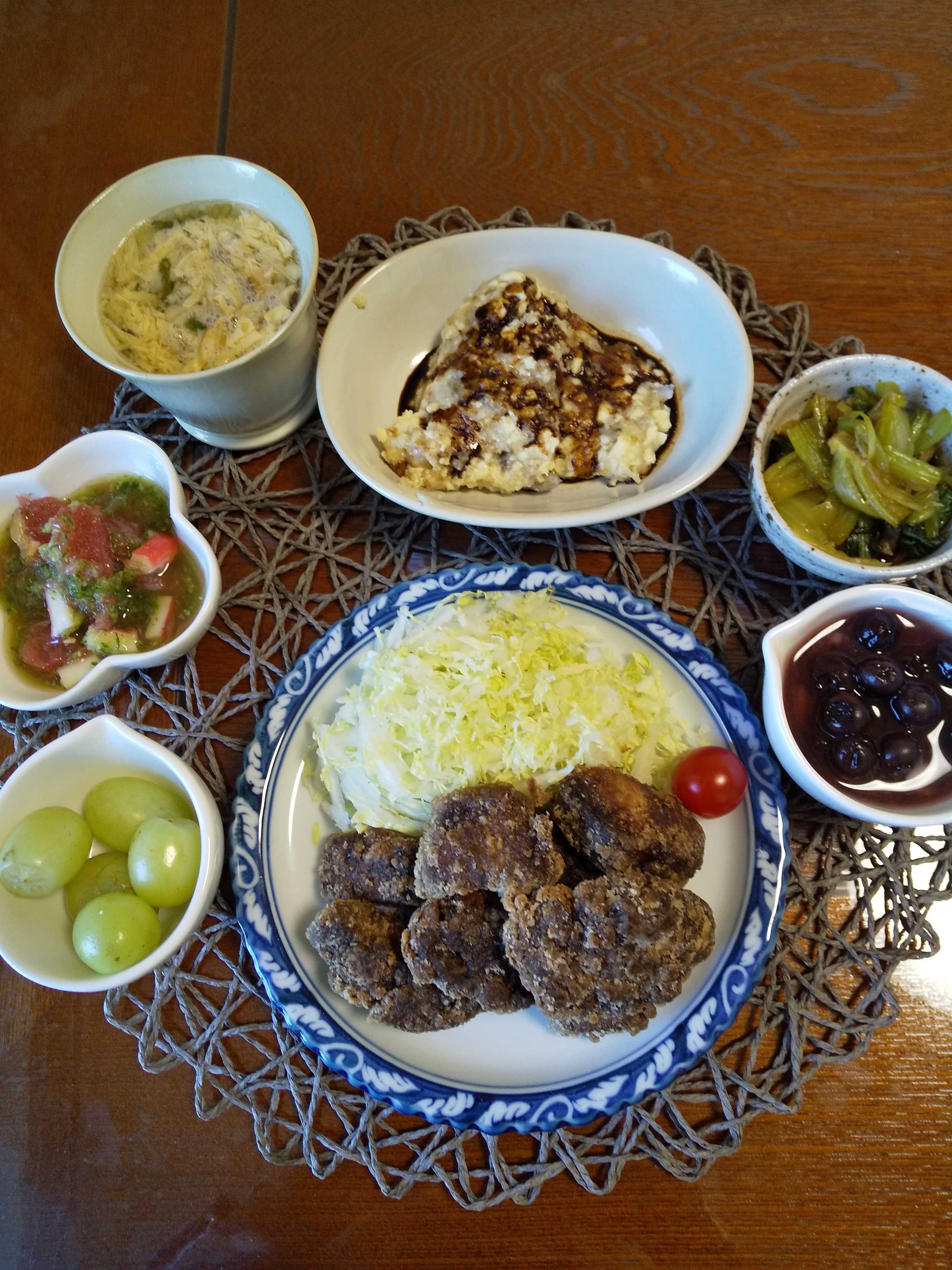 今日の夕飯です。 鮪は焼き肉のたれに漬け込み片栗粉をつけて油で揚げました。 鮪の竜田揚げ 蓮根豆腐 小松菜と油揚げの和え物 グレープフルーツの新緑和え ぶどう ブルーベリーヨーグルト 和風スープ