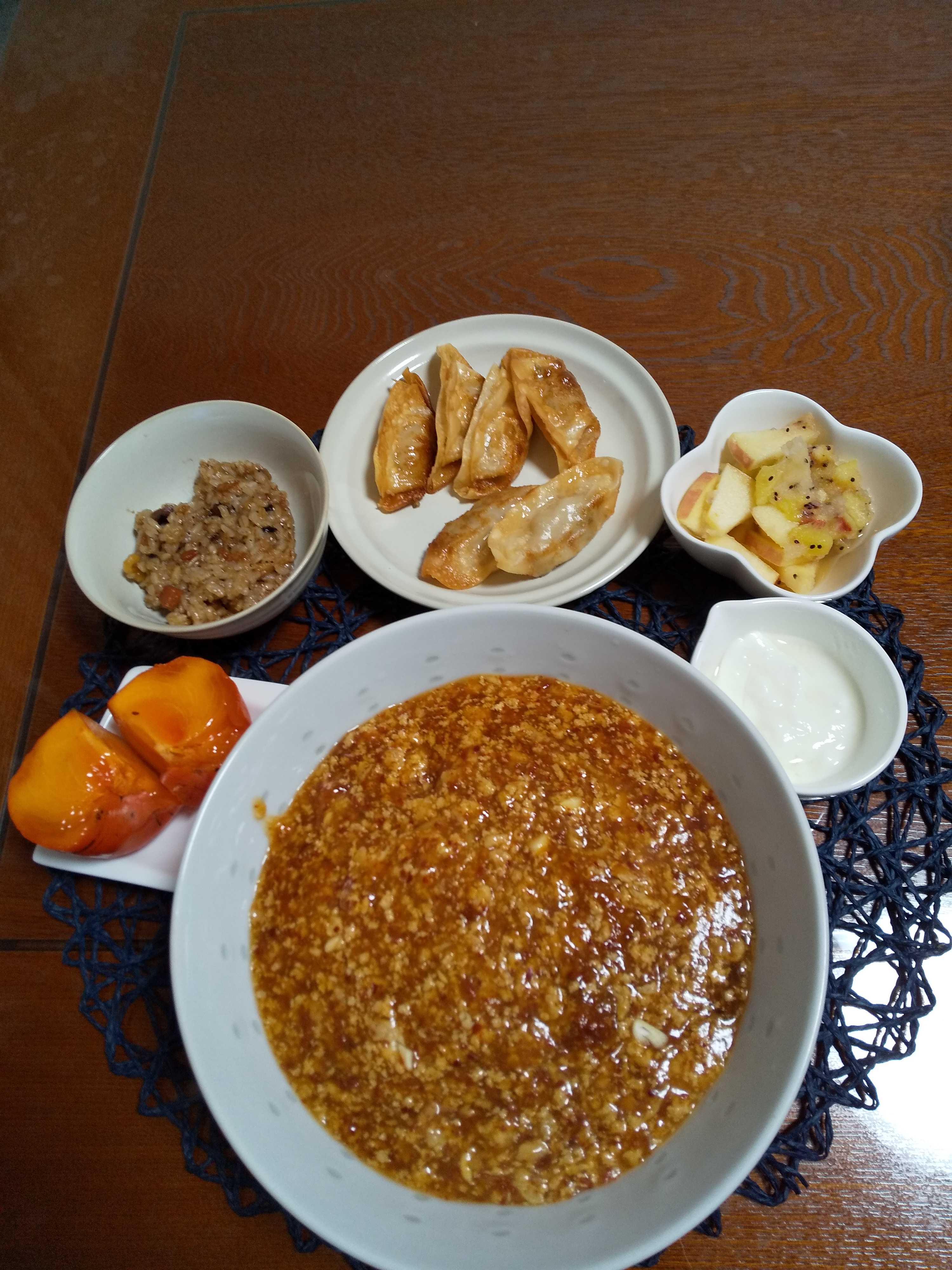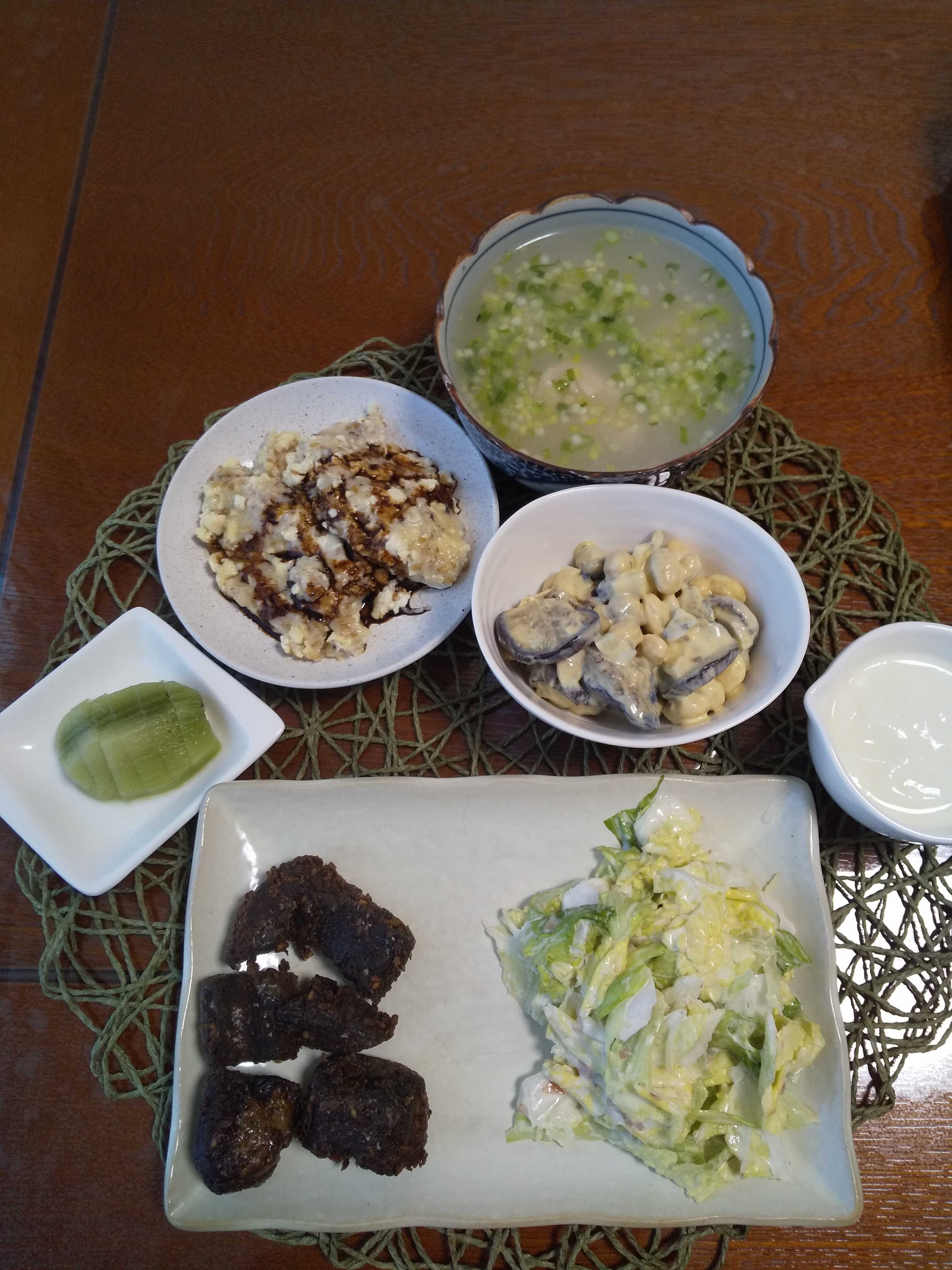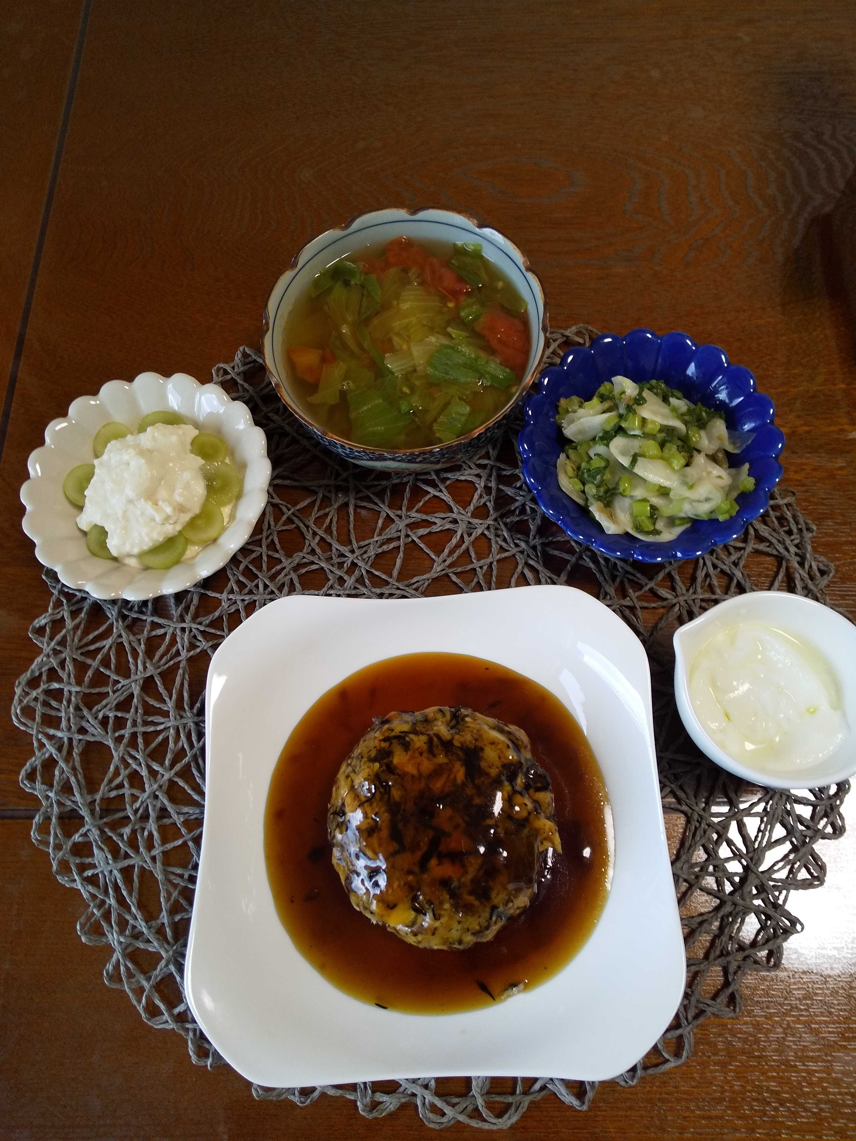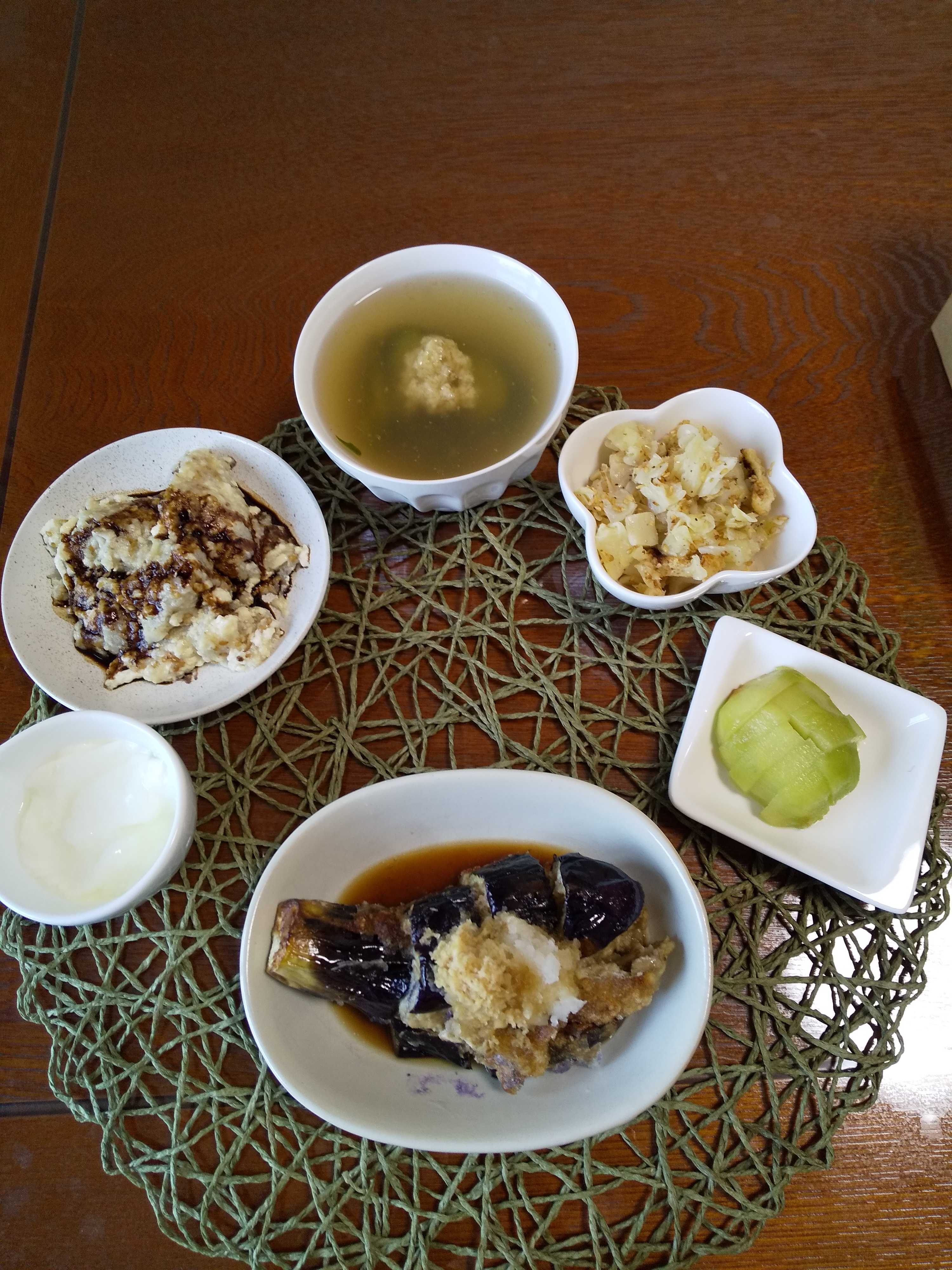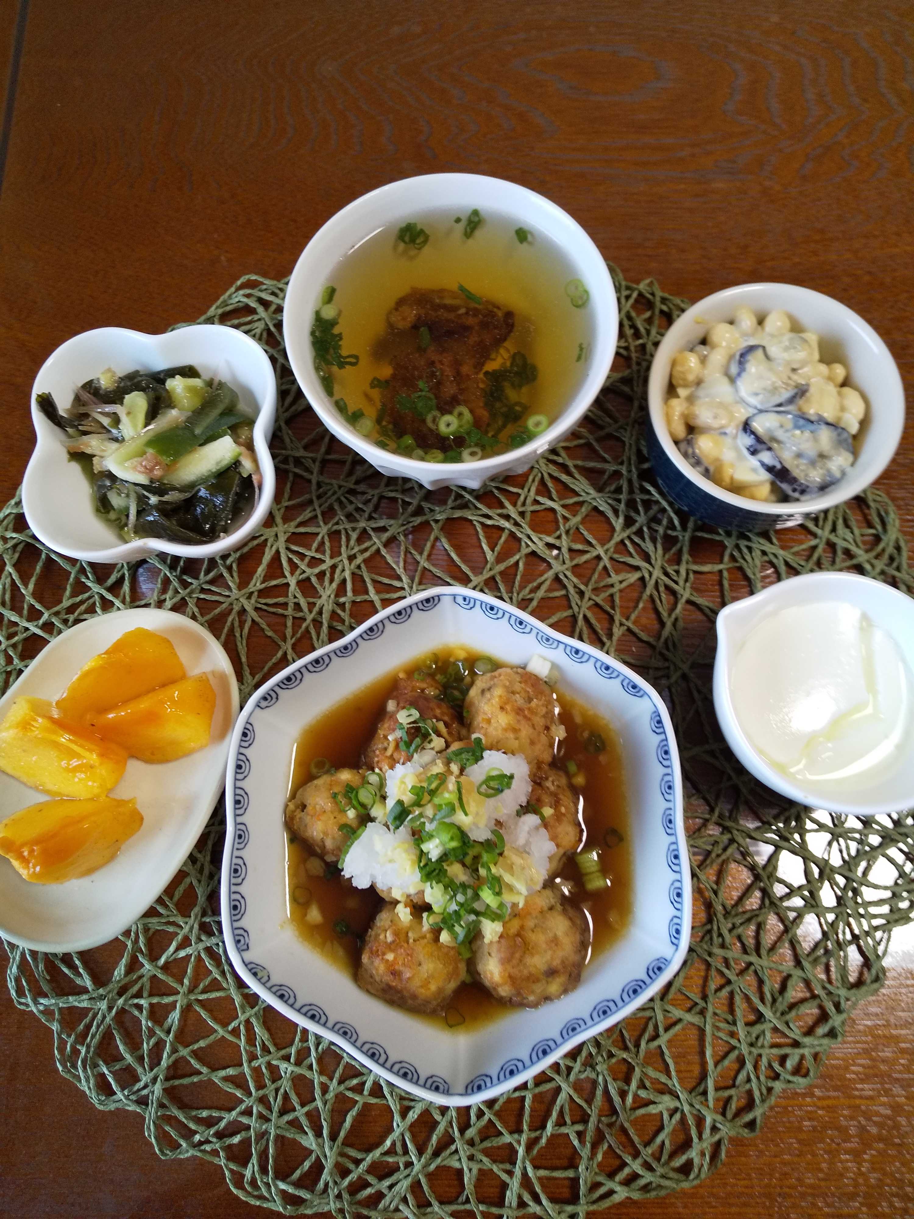 今日の夕飯です。 豆腐入り肉団子のおろしがけを作りました。 豆腐入り肉団子のおろしがけ 茄子の黄身和え わかめの梅風味サラダ 柿 はちみつヨーグルト 揚げ蓮根団子のすまし汁