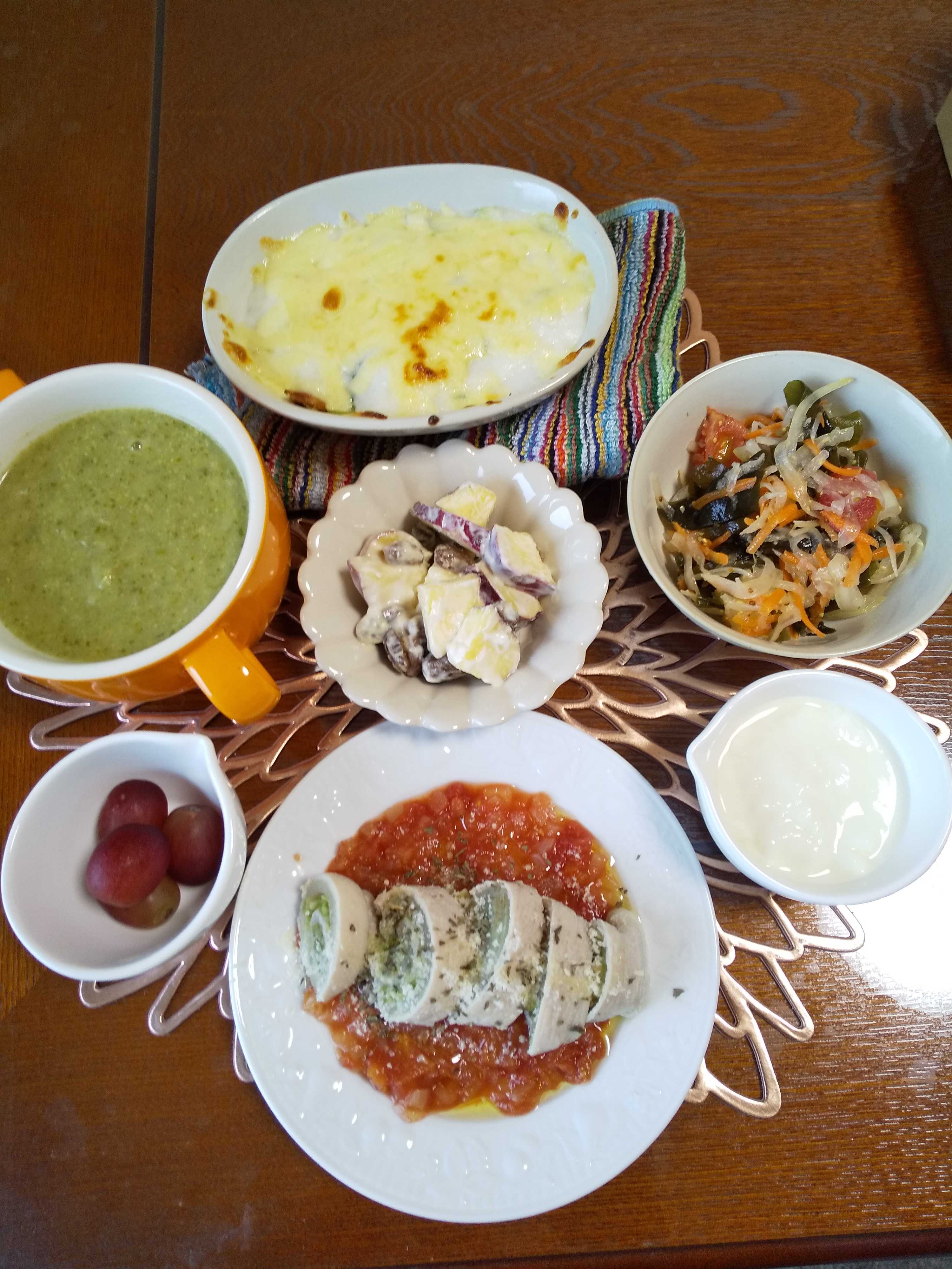 今日の夕飯です。 ポークロールのトマトソースを作りました。 白菜は茹でて半部に切り薄切り豚肉に塩と胡椒を振り小麦粉を振り 豚肉の上に白菜をのせ端から巻きラップで包み電子レンジで加熱する。 トマトソースを作り器に敷き巻いた豚肉を切り盛り付ける。 ポークロールのトマトソース 小松菜のグラタン さつま芋のヨーグルト和え ワカメのマスタード風味サラダ ぶどう はちみつヨーグルト 何でもスープ