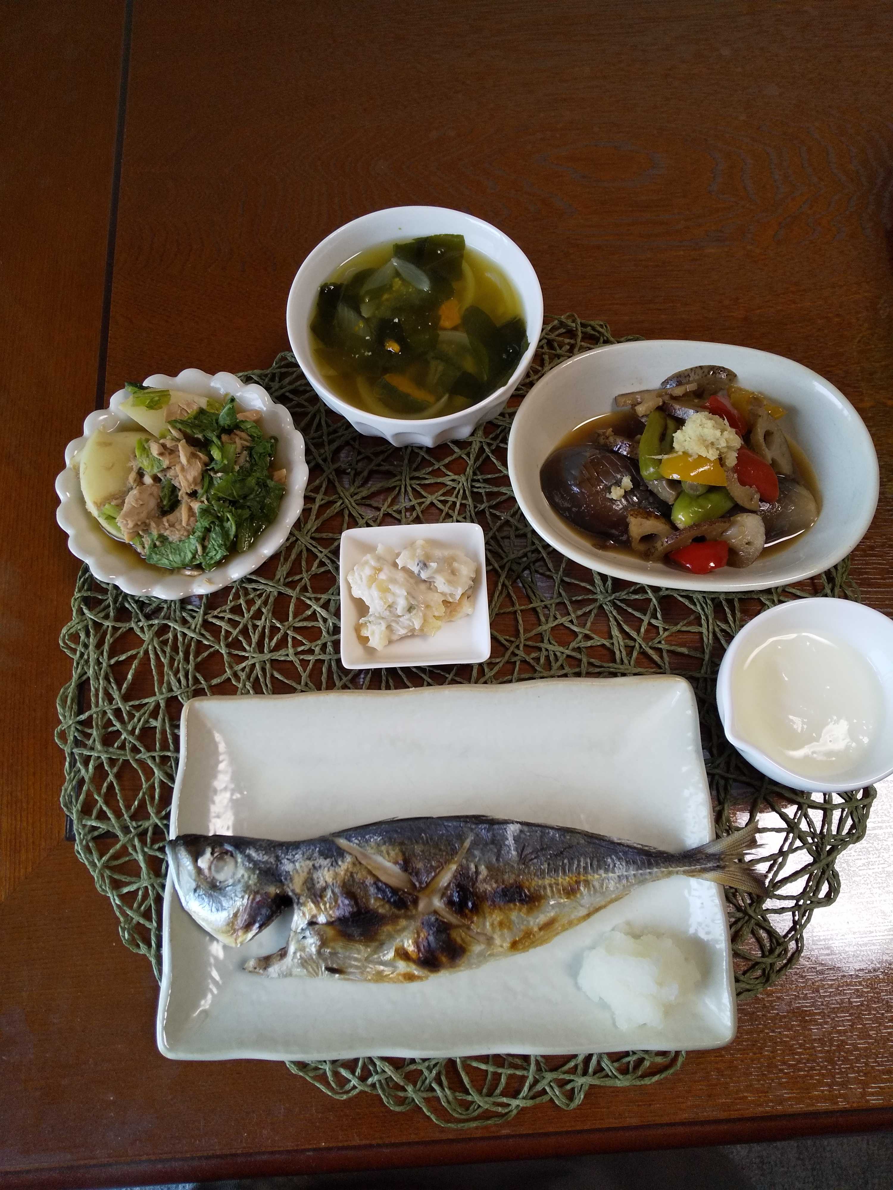 今日の夕飯です。 鰺の塩焼きにだいこんおろしを添えて頂きました。 「なすの彩り焼きびたし」を作りました。 鰺の塩焼き大根おろし添え なすの彩り焼きびたし 蕪とツナの煮物 ワサビ漬け はちみつヨーグルト 玉ねぎと南瓜とわかめの味噌汁