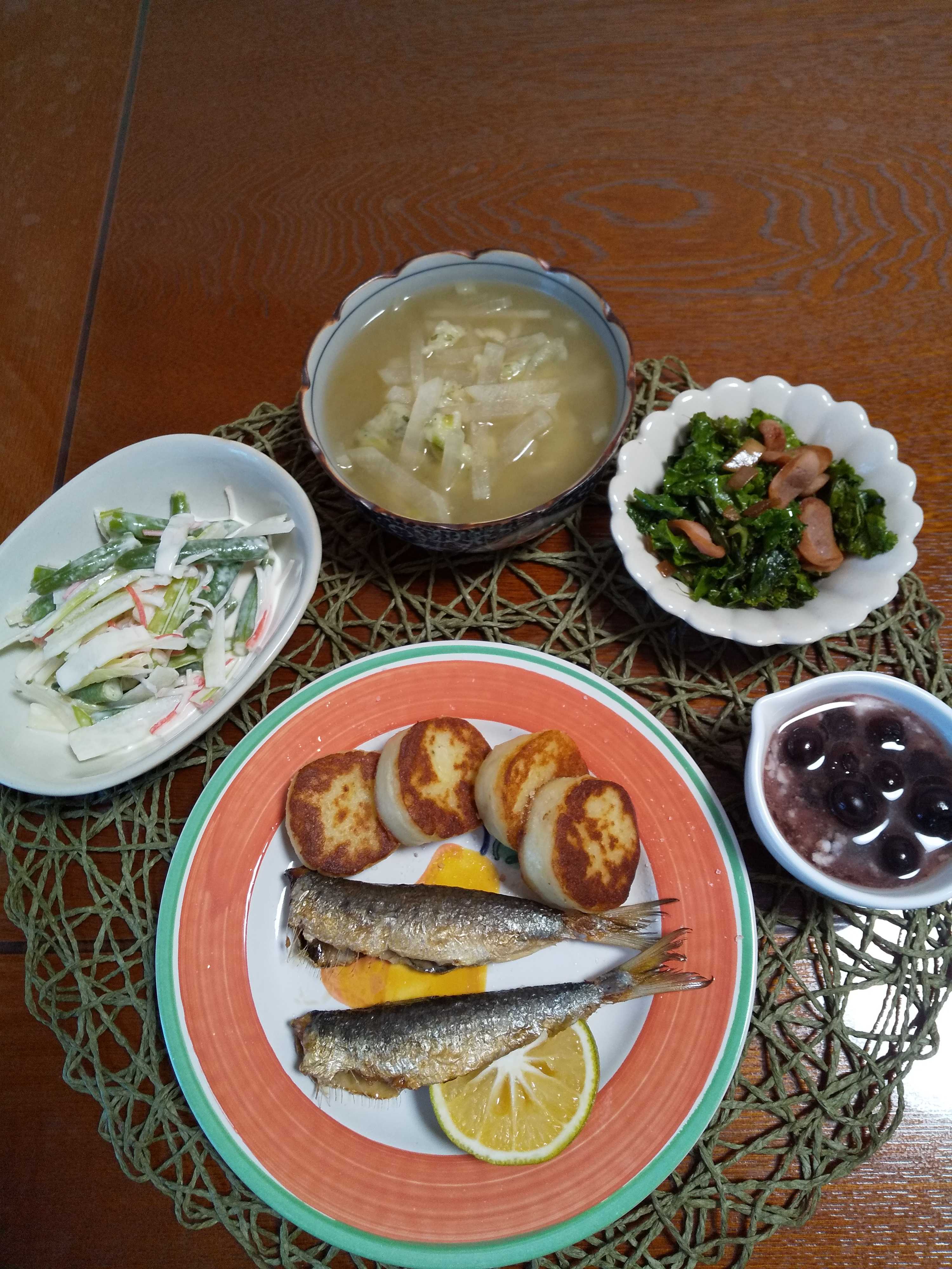 今日の夕飯です。 「高山なおみさん 鰯の塩焼きポルトガル風」を作りました。 ゆで卵を添えるのを忘れました( ;∀;) 「高山なおみさん じゃがいももち」も作りました。 鰯の塩焼きポルトガル風 じゃがいももち ケールとウィンナーの炒め物 セロリとインゲンのサラダ ブルーベリーヨーグルト 大根と蕪の葉のすいとんスープ
