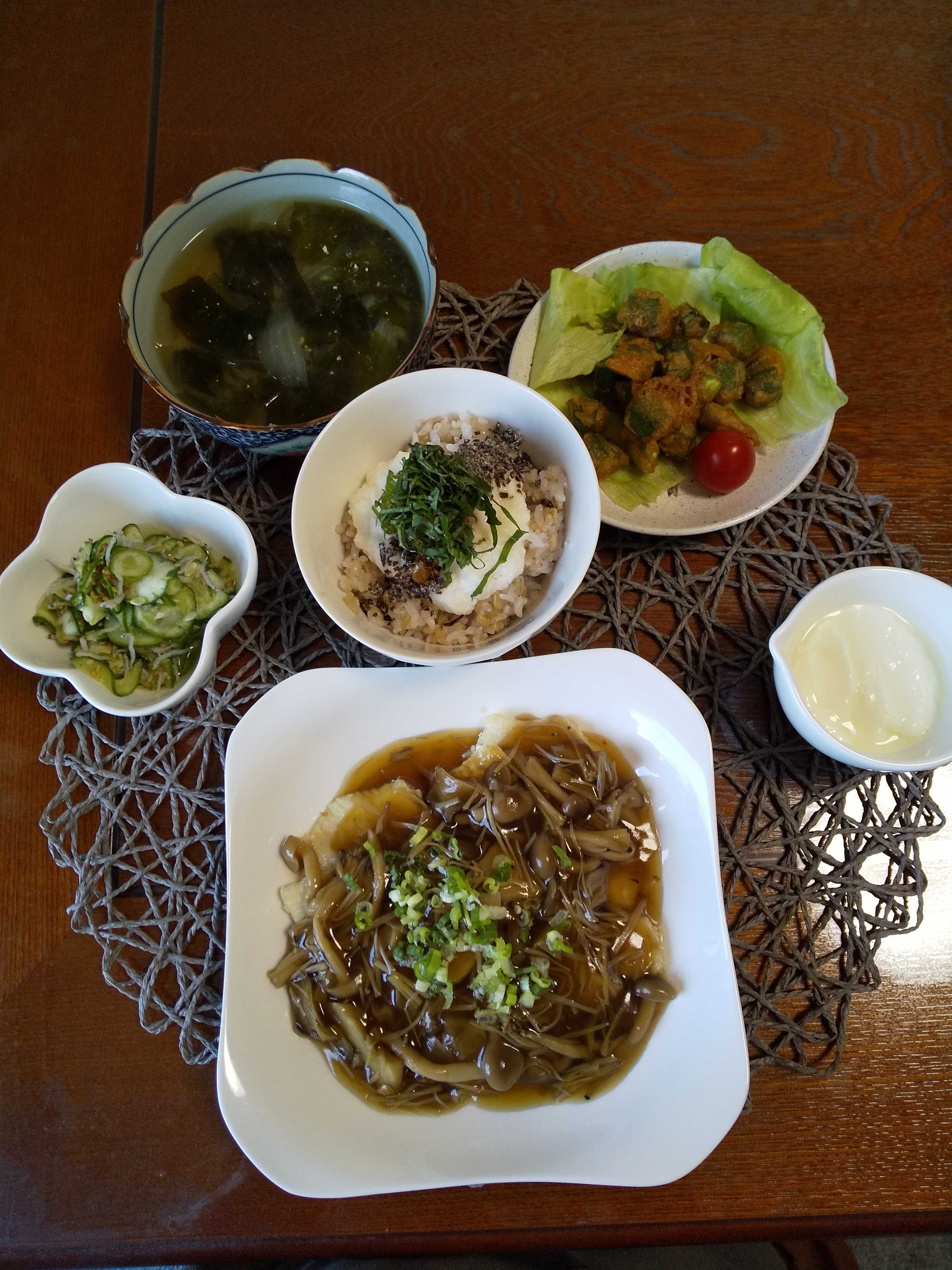今日の夕飯です。 鶏肉のソテーキノコあんかけを作りました。 梅入りふわシャキとろろご飯を作りました。 オクラを市販の唐揚げ粉を使い唐揚げを作りました。 鶏肉のソテーキノコあんかけ 梅入りふわシャキとろろご飯 オクラの唐揚げ 胡瓜と雑魚の酢の物 はちみつヨーグルト 玉ねぎとわかめの味噌汁