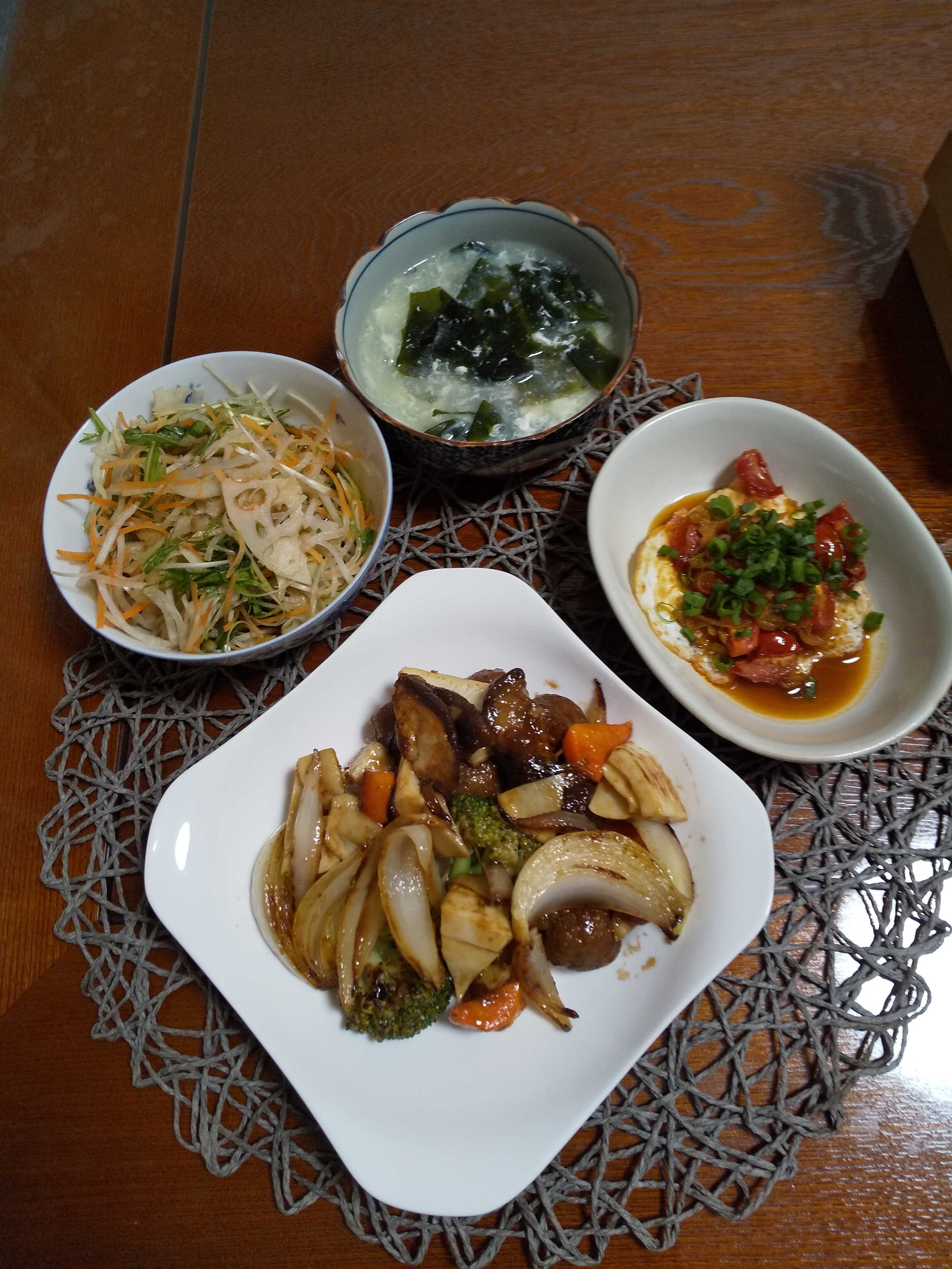 今日の夕飯です。 黒酢肉団子とブロッコリーと人参と玉ねぎと椎茸と竹の子を入れて 作りました。 黒酢肉団子と野菜の炒め煮 包み卵のトマトソース煮 根菜のだし割りサラダ 春雨とわかめの卵白スープ