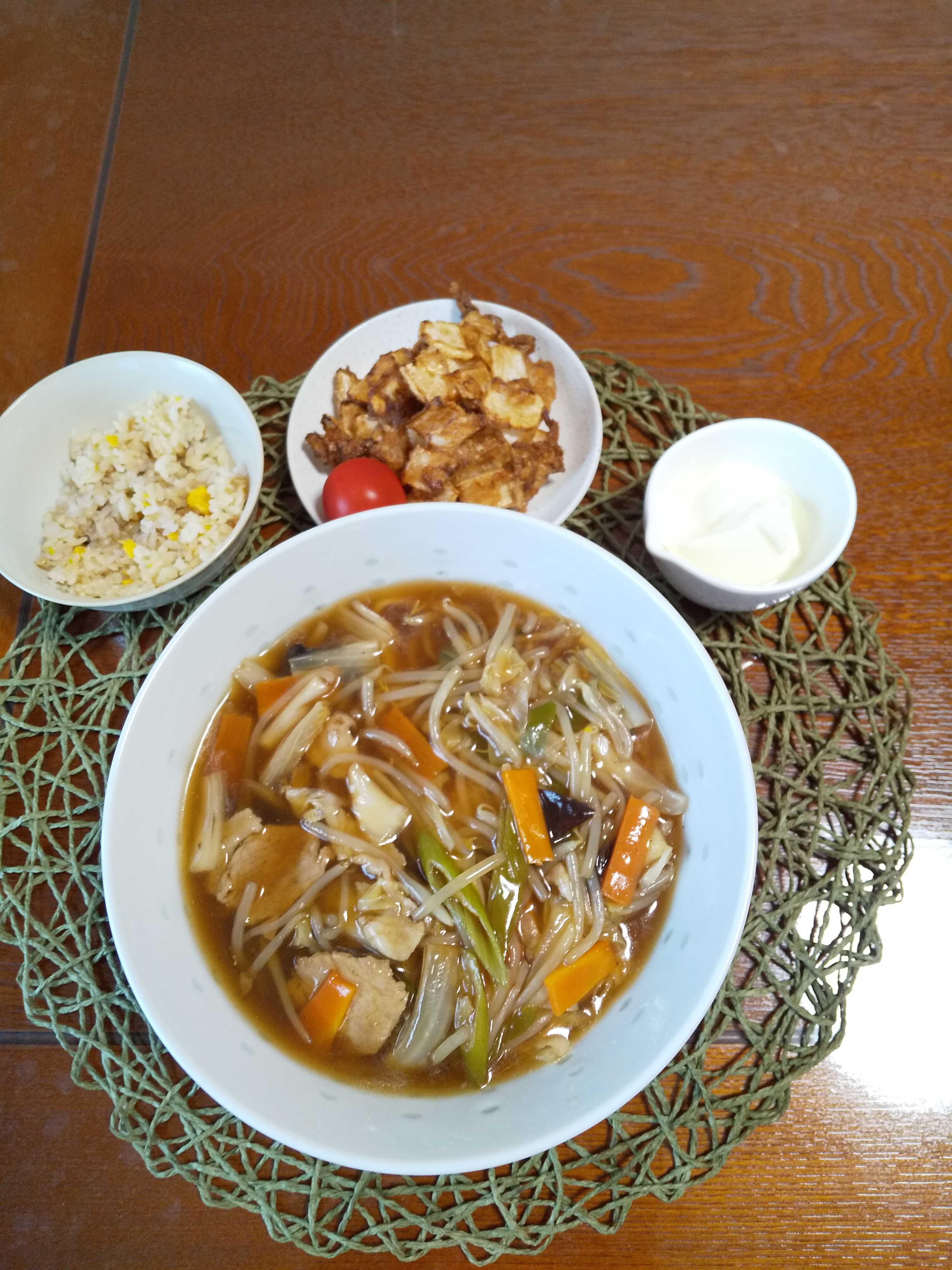 今日の夕飯です。 中華麺の代わりにうどんで広東麵を作りました!(^^)! うどんでも美味しかったのでこれからも作ってみたい思いました。 広東うどん 白菜の唐揚げ 炒飯 はちみつヨーグルト