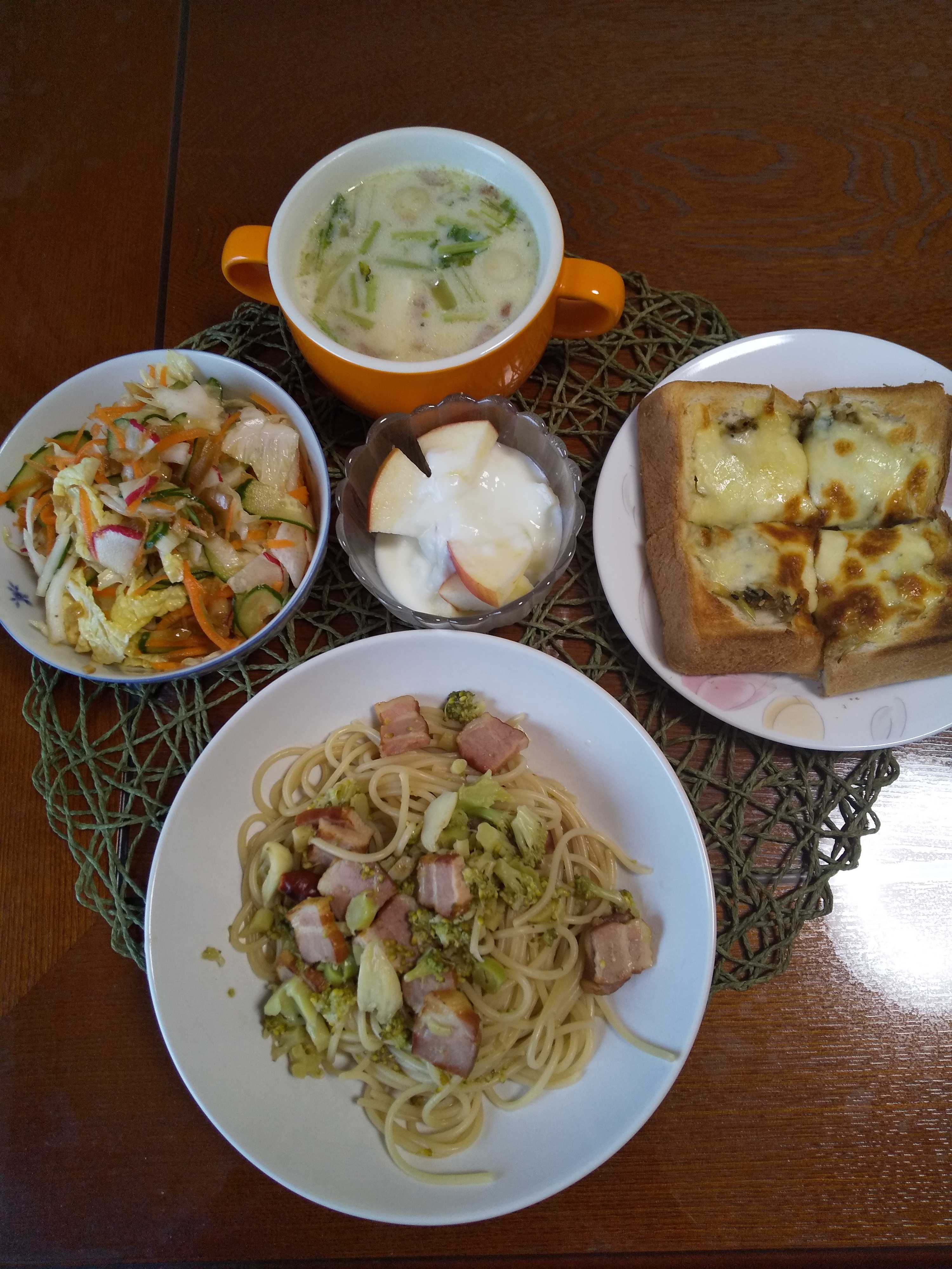 今日の夕飯です。 ブロッコリーたっぷりパスタを作りました。 ブロッコリーたっぷりパスタ 野菜サラダ りんごヨーグルト へコパン 蕪としめじのスープ