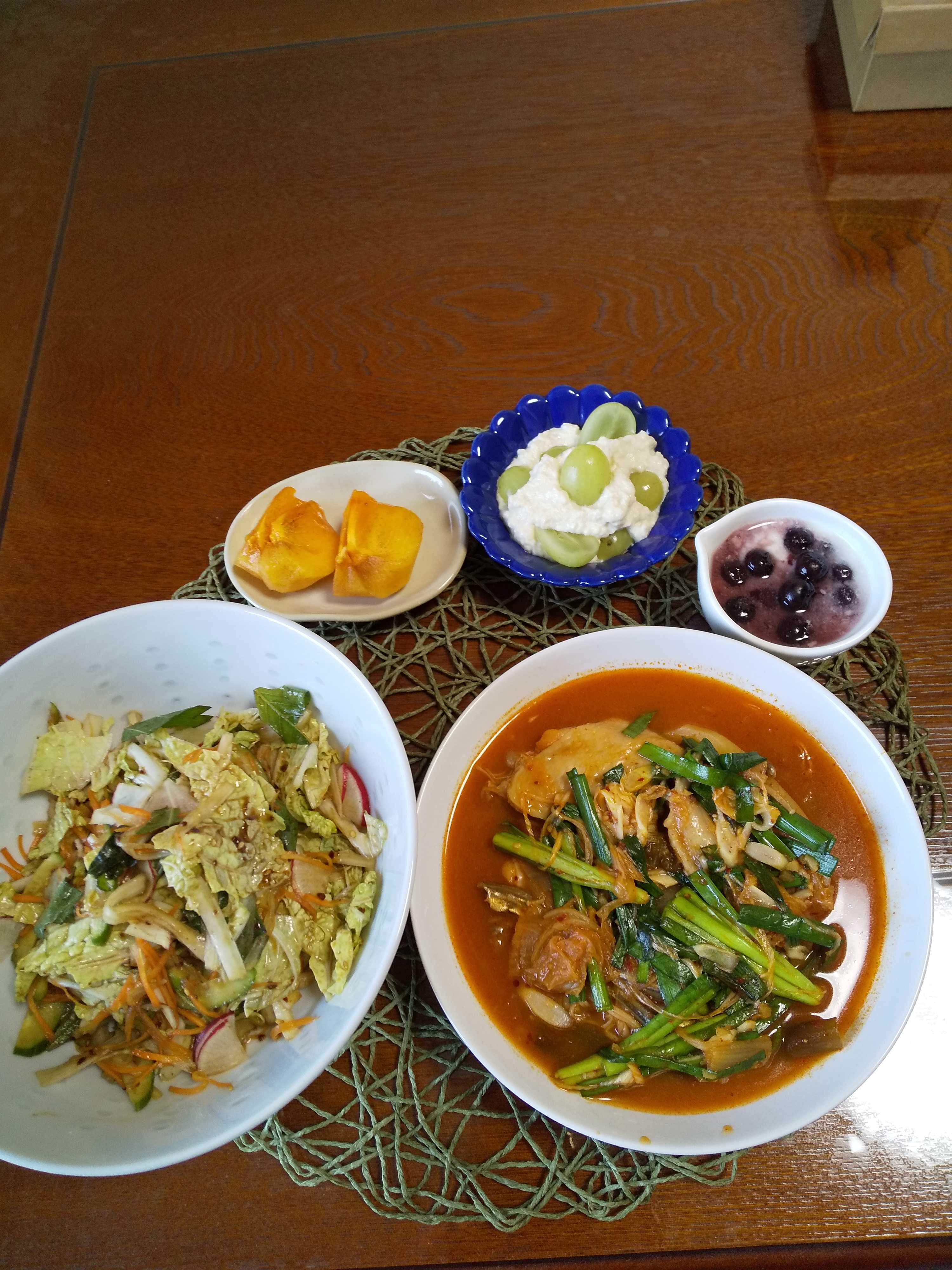 今日の夕飯です。 炊飯器で作るカムジャータン風スープを作りました。 手羽先は骨に沿って切り込みを入れメークインは皮を剝き縦半分に切り えのきの石づきを切り落とし長ネギ青い部分をぶつ切りにして 炊飯器に内釜に手羽先とじゃが芋とえのきと長ネギとキムチを入れ 5cm角昆布と煮干し3gとコチュジャン大匙1と味噌大匙1と 醤油小匙2と鶏ガラスープの素小匙2と酒大匙1とすりおろし大蒜小匙1と すりおろし生姜小匙1と水600mlを入れて普通の炊飯で炊く。 炊き上がったら斜め切り長ネギと5cm韮を入れて蒸らし器に盛る。 カムジャータン風スープ 韓国風まぜまぜビビンバ ぶどうのクリーミー白和え ブルーベリーヨーグルト 柿
