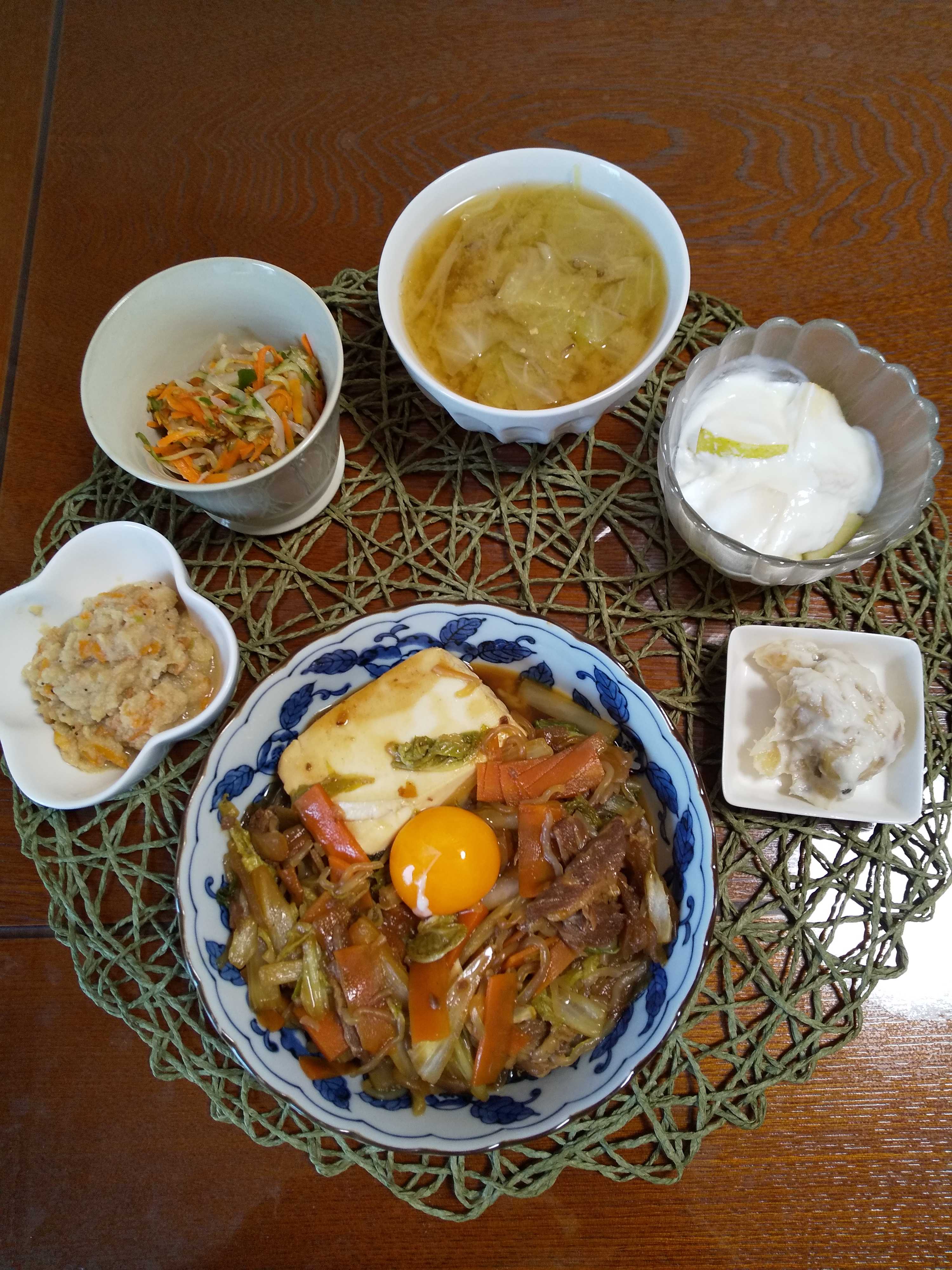 今日の夕飯です。 レトルトの牛丼を使ってすき家風すき焼き牛丼を作りました。 時短で美味しく作れるのが嬉しいです!(^^)! すき家風すき焼き牛丼 おからの煮物 もやしなます りんごヨーグルト わさび漬け きゃべつの味噌汁