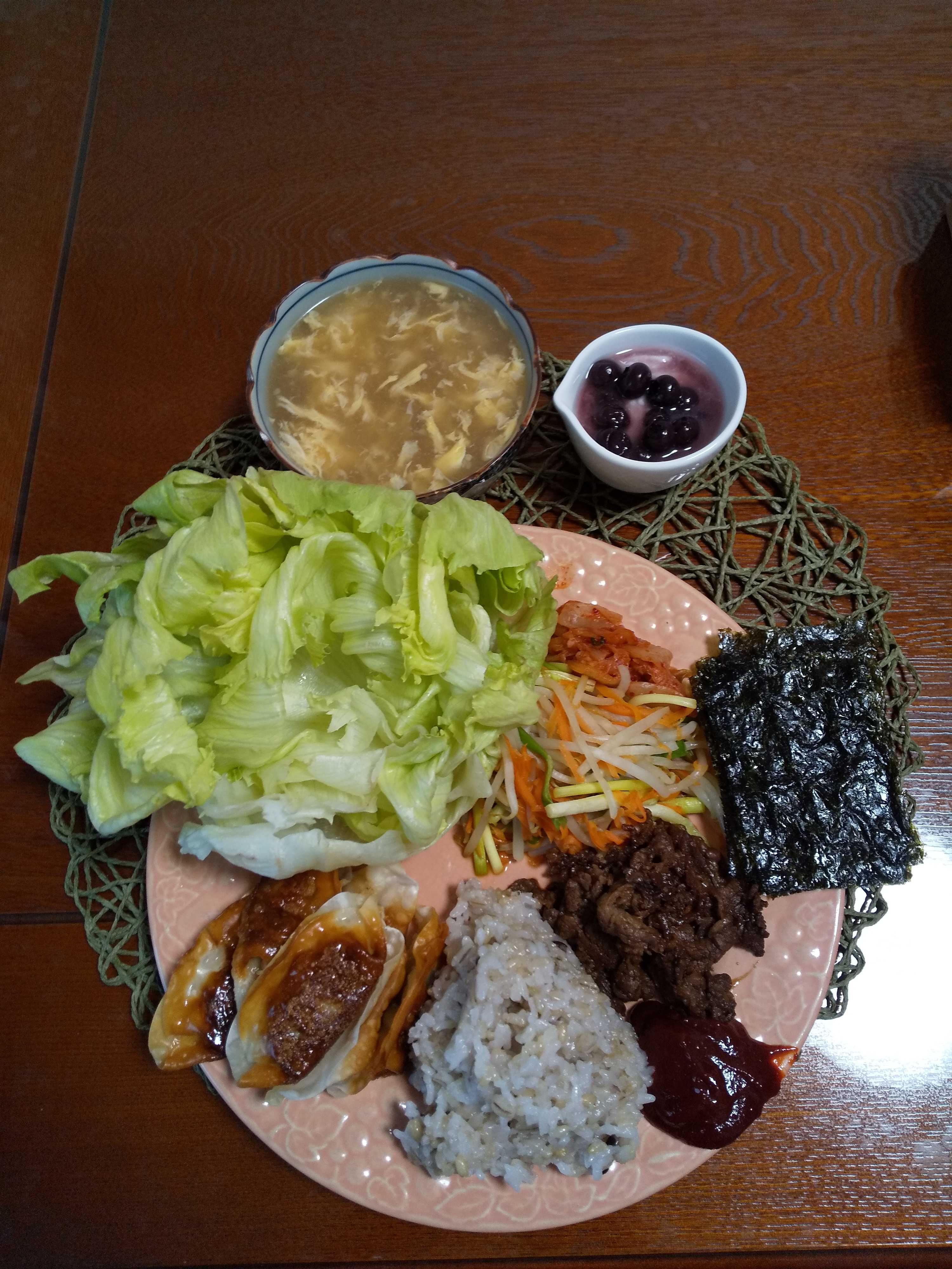 今日の夕飯です。 手巻きプルコギを作りました。 プルコギともやしと人参と細ネギの蒸し野菜とキムチとレタスと 韓国海苔とご飯と揚げ餃子をワンプレートにして頂きました!(^^)! 手巻きプルコギ ブルーベリーヨーグルト 卵スープ