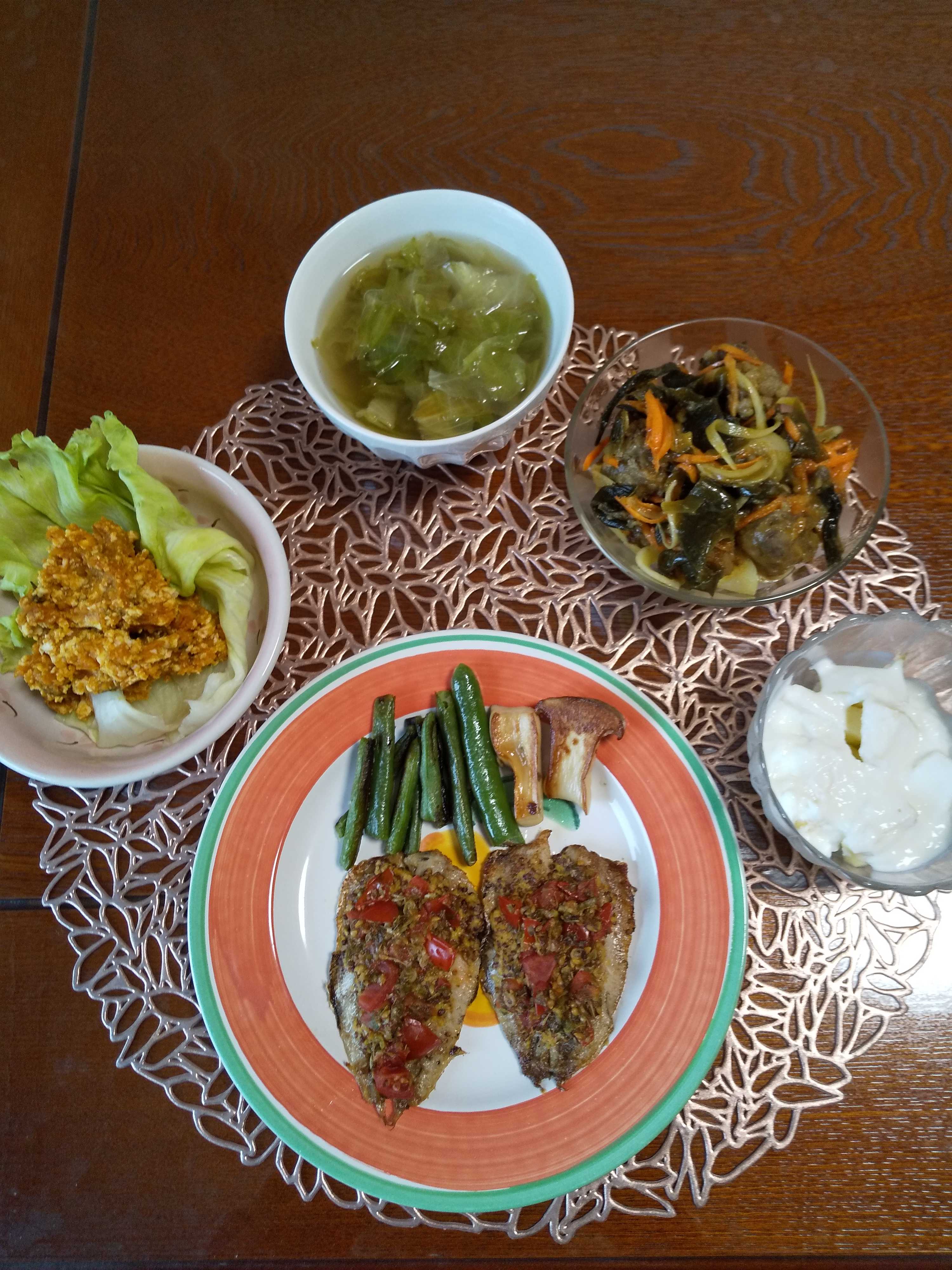 今日の夕飯です。 焼きざけとたっぷり野菜のレモンづけを作りました。 野菜をしっかり頂けるのが嬉しいです!(^^)! 焼きざけとたっぷり野菜のレモンづけ 豆腐のかつお節まぶし焼き 南瓜のチーズクリームホットサラダ 大根の皮の金平 キウイフルーツ はちみつヨーグルト 白菜とわかめの味噌汁