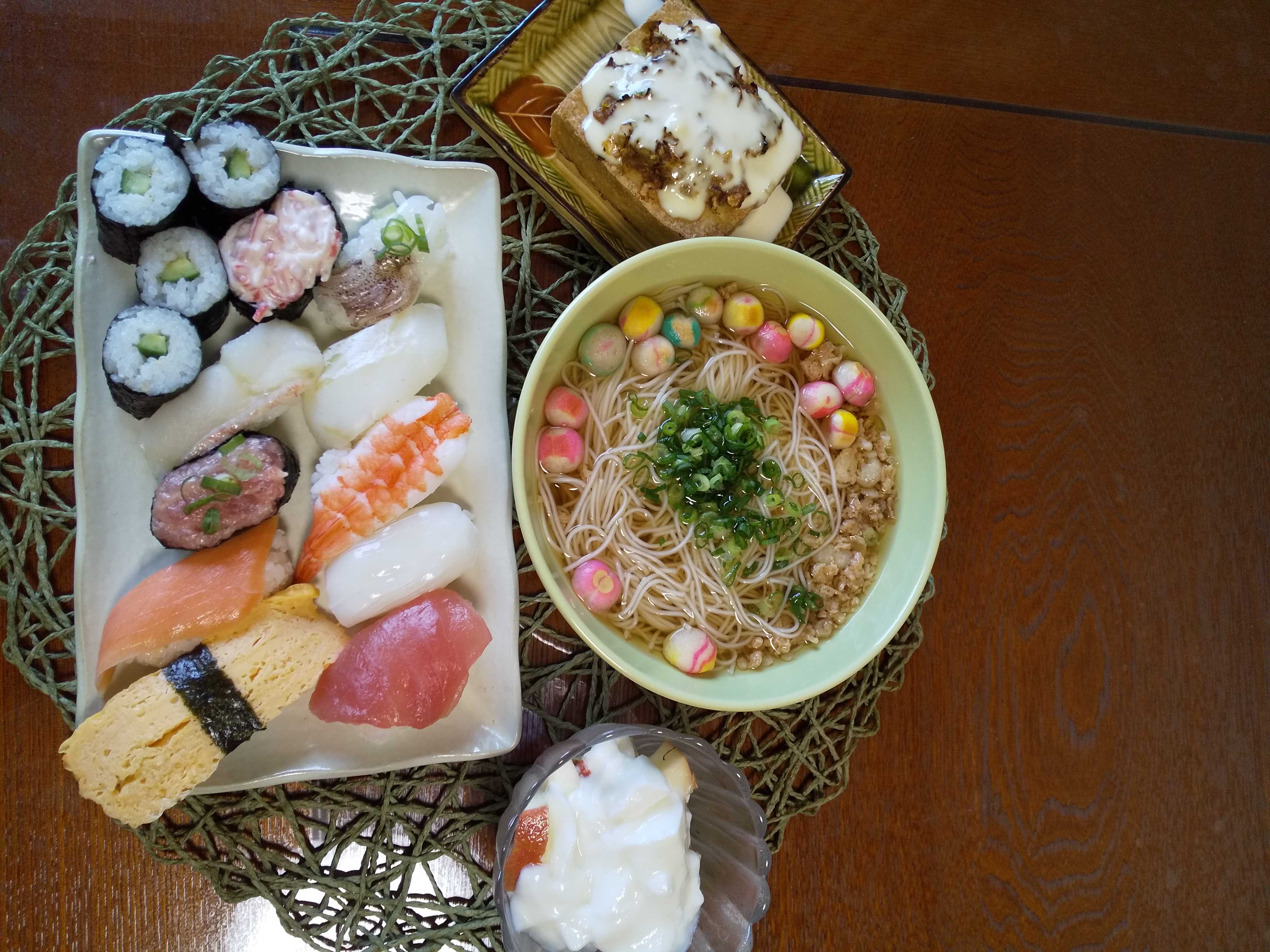 今日の夕飯です。 お寿司と久久しぶりににゅう麺作りを添えて頂きました。 寿司 厚揚げこんがりステーキ にゅう麺 りんごヨーグルト
