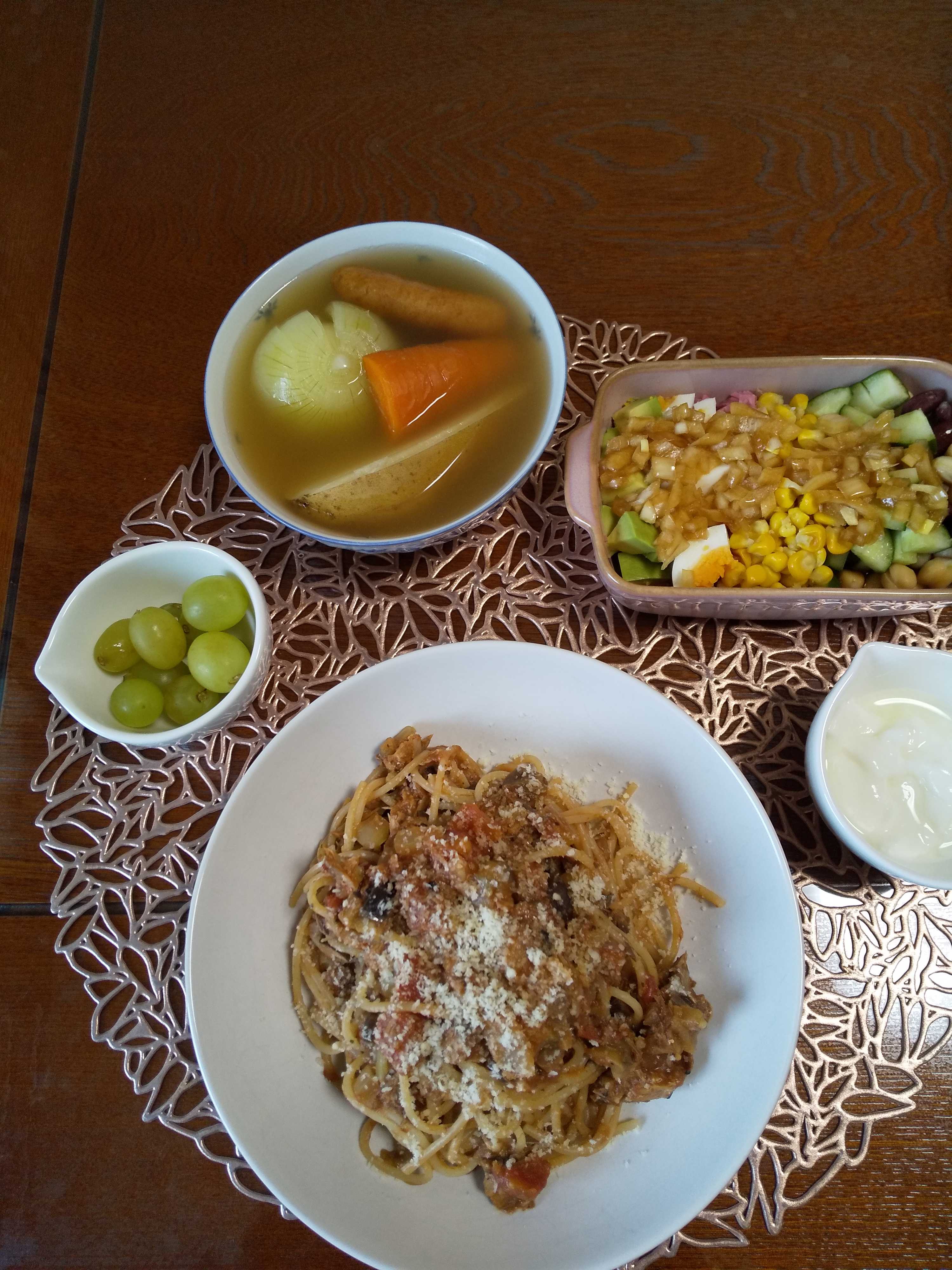 今日の夕飯です。 さば水煮缶とみじん切り玉ねぎと粗みじん切り茄子とみじん切り ニンニク1かけをオリーブ油で炒めとホールトマト缶とさば水煮缶を加え 粒品ながら炒めコンソメと塩と胡椒を加え茹でたパスタを加えよく絡め 器に盛り粉チーズを振る。 サバ缶となすのトマトソースパスタ コブサラダ ぶどう はちみつヨーグルト ポトフ