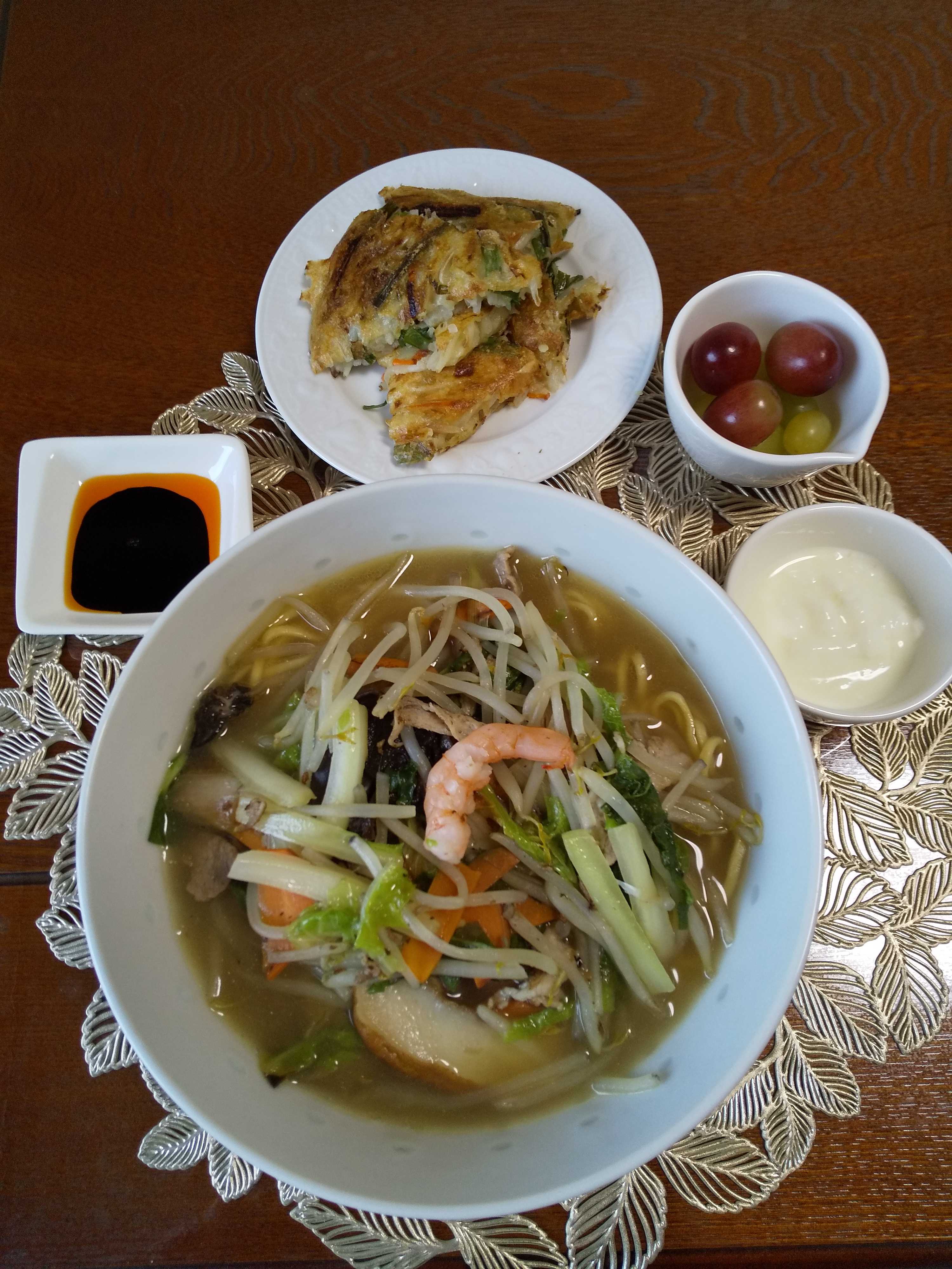 今日の夕飯です。 日清ラ王ちゃんぽんを作りました。 副菜にチヂミを作りました。 ちゃんぽん チヂミ ぶどう はちみつヨーグルト