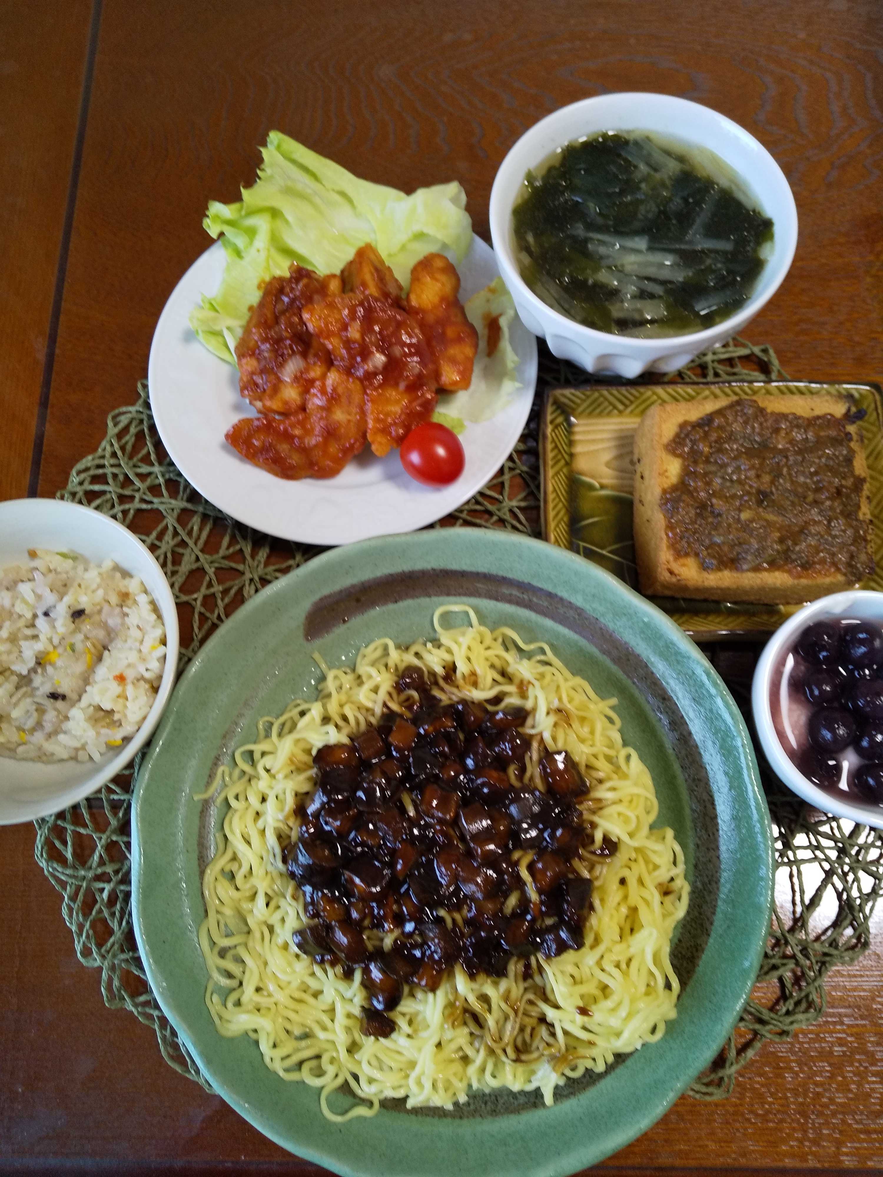 今日の夕飯です。 茄子入りのジャージャー麵を作りました。 副菜に絹厚揚げにねぎ味噌をつけてオーブントースターで こんがりと焼きました。 茄子のジャージャー麵 おからでモチモチ旨いエビチリ風 絹厚揚げのねぎ味噌焼き 炒飯 ブルーベリーヨーグルト 大根とわかめのスープ