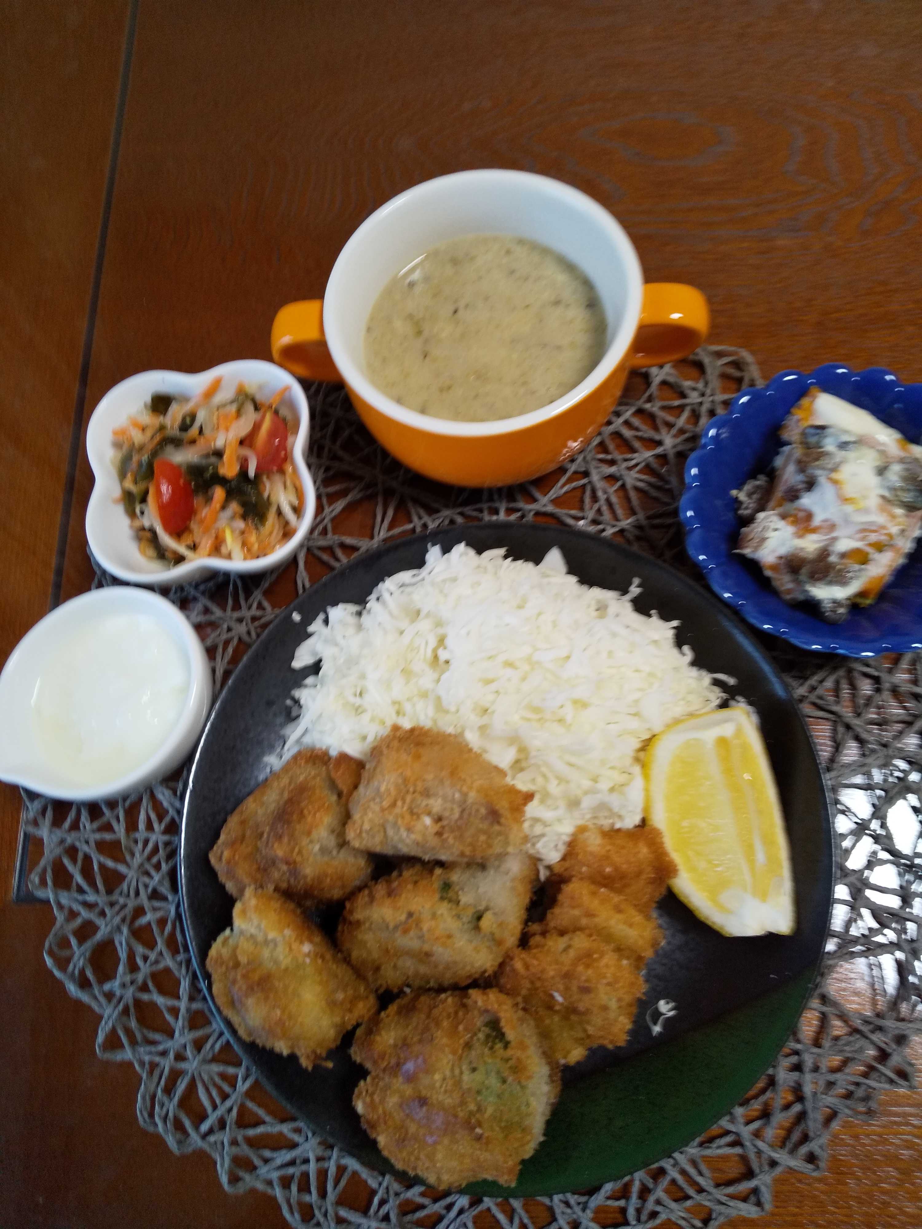 今日の夕飯です。 鰮缶とみじん切り玉ねぎと粗みじん切り紫蘇と小麦粉を入れて混ぜ 四等分にして形成して小麦粉と溶き卵とパン粉をつけ油で揚げる。 鰯メンチ 根菜グラタン 春菊と柿のサラダ ブルーベリーヨーグルト きのこときゃべつのスープ