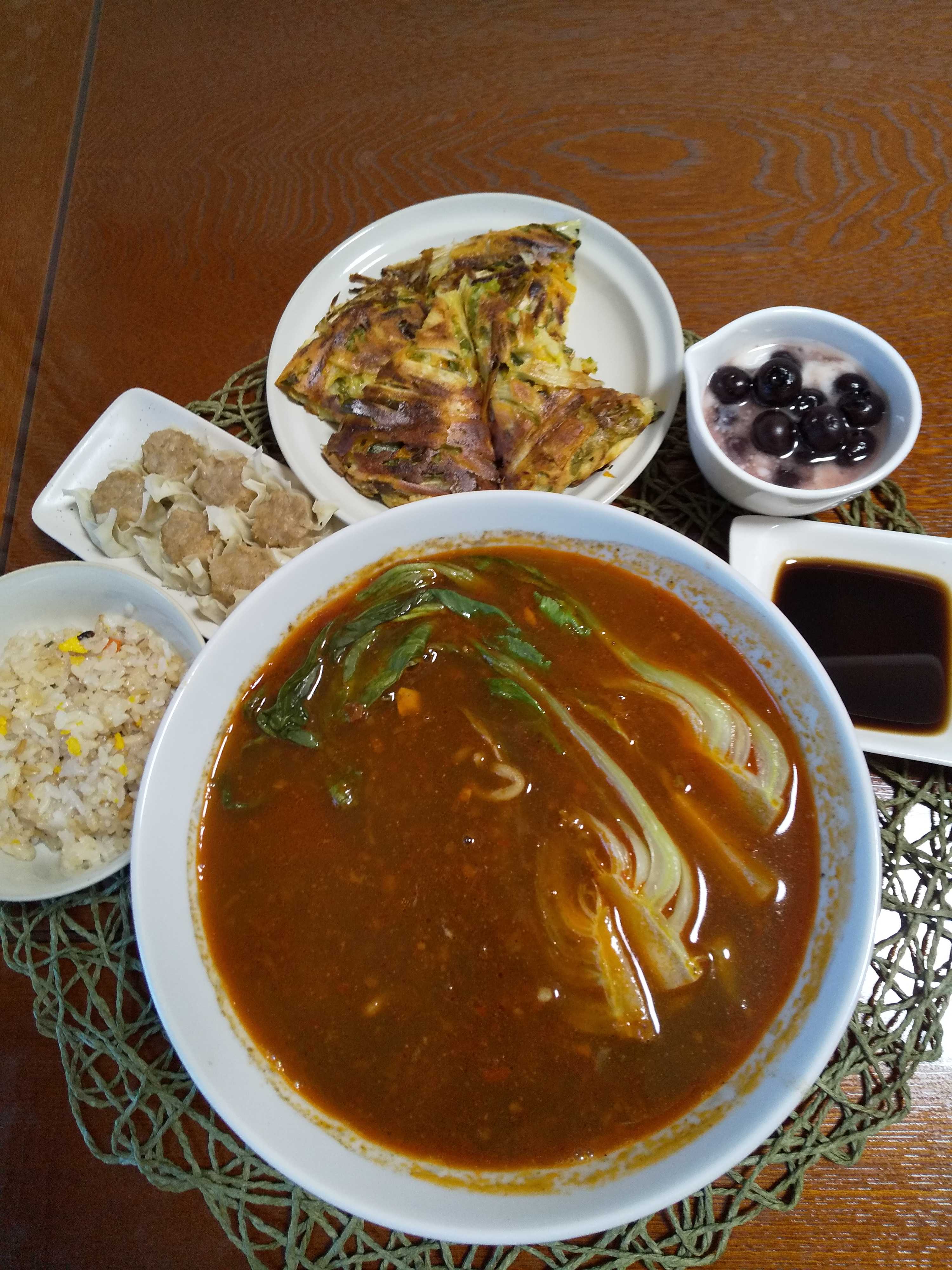 今日の夕飯です。 黒胡麻担々麵を作りました。 黒胡麻担々麵 チヂミ 炒飯 焼売 ブルーベリーヨーグルト