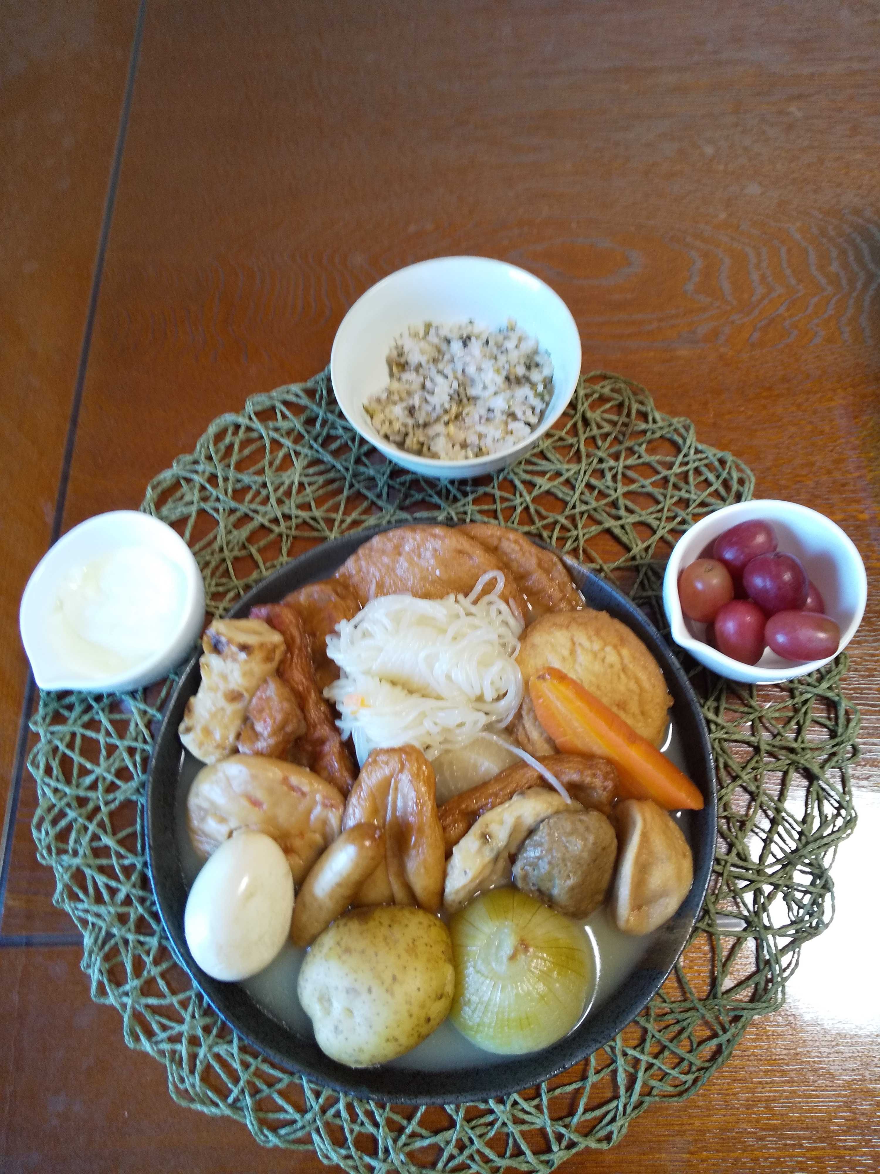 今日の夕飯です。 おでんを作りました。 今回は小玉ねぎを入れて作ってみました。 美味しかったので次回から入れて作ってみたいと思いました!(^^)! 青菜ごはん用のひろしを使い混ぜご飯を作りました。 おでん 青菜ごはん ぶどう はちみつヨーグルト