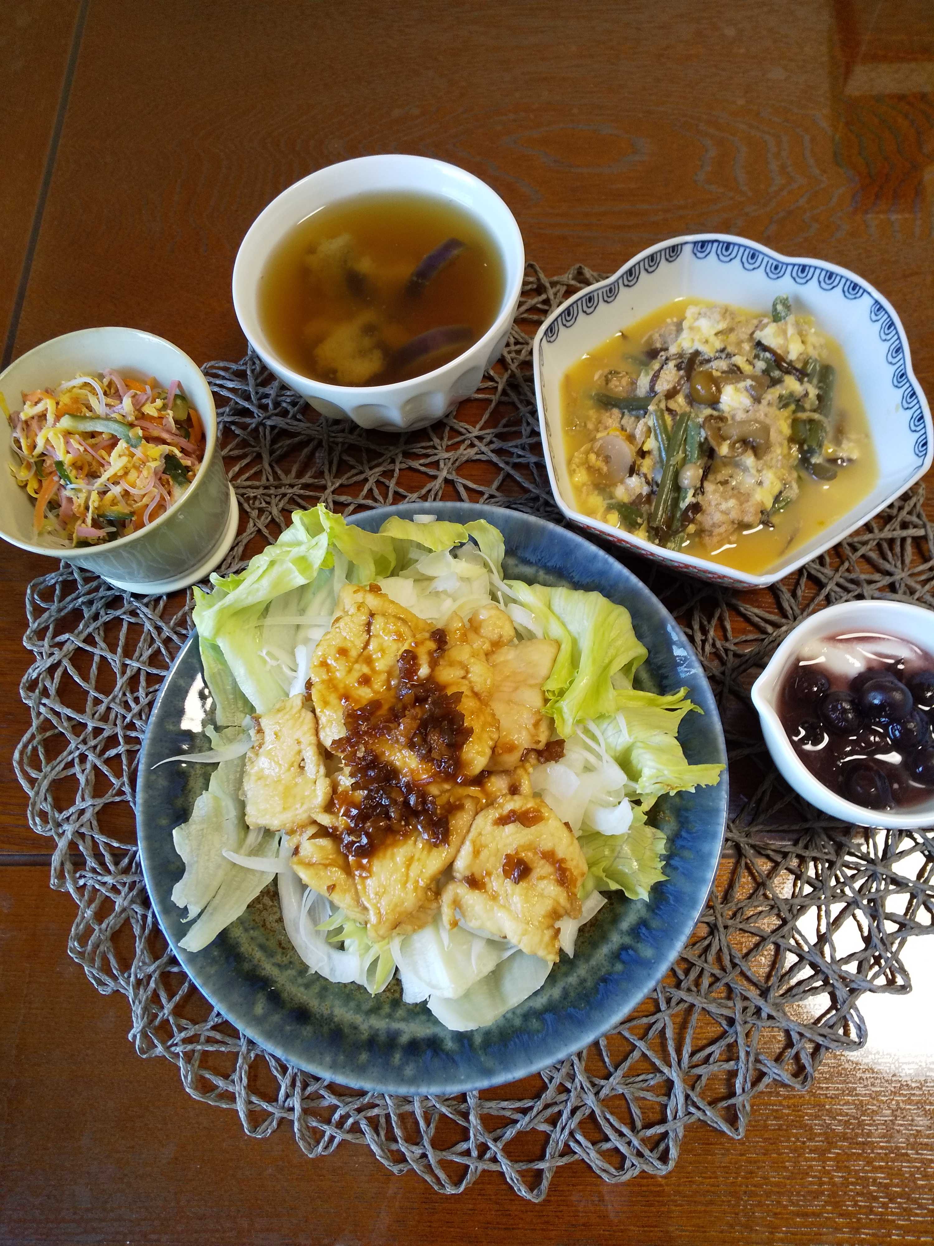 今日の夕飯です。 鶏胸肉はそぎ切りして塩を振り小麦粉をつけフライパンにサラダ油を熱し 鶏肉を両面焼き取り出す。 器にレタスと薄切り玉ねぎをのせ焼いたとにりくをのせる。 ザーサイにみじん切りとみりんと醤油と酢とサラダ油を鶏肉を焼いた フライパンに入れて一煮立ちさせ鶏肉かけて頂きました。 鶏肉と野菜のホットサラダ はらこと山菜の卵とじ 春雨サラダ ブルーベリーヨーグルト 茄子の味噌汁