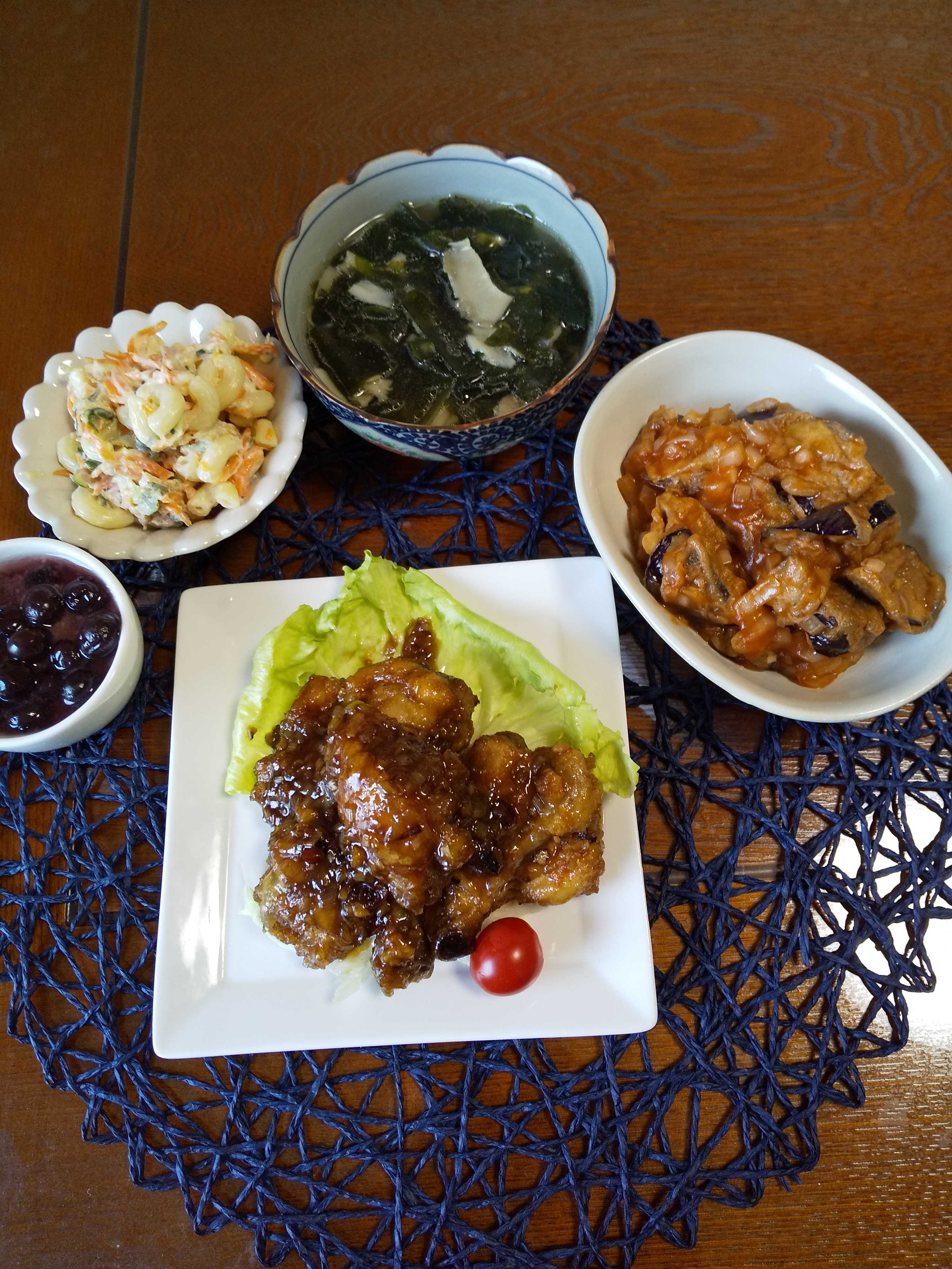 今日の夕飯です。 鶏手羽元に酒と醤油で下味をつけ片栗粉をつけて油であ揚げ。 砂糖と醤油と酢と水とみじん切り葱と小口切り赤唐辛子と みじん切り生姜を煮立て揚げた鶏手羽元を入れて絡める。 鶏手羽元の揚げ煮 茄子のマンチュリアン マカロニサラダ ブルーベリーヨーグルト 舞茸とわかめのスープ 鶏手羽元の揚げ煮 茄子のマンチュリアン マカロニサラダ ブルーベリーヨーグルト 舞茸とわかめのスープ
