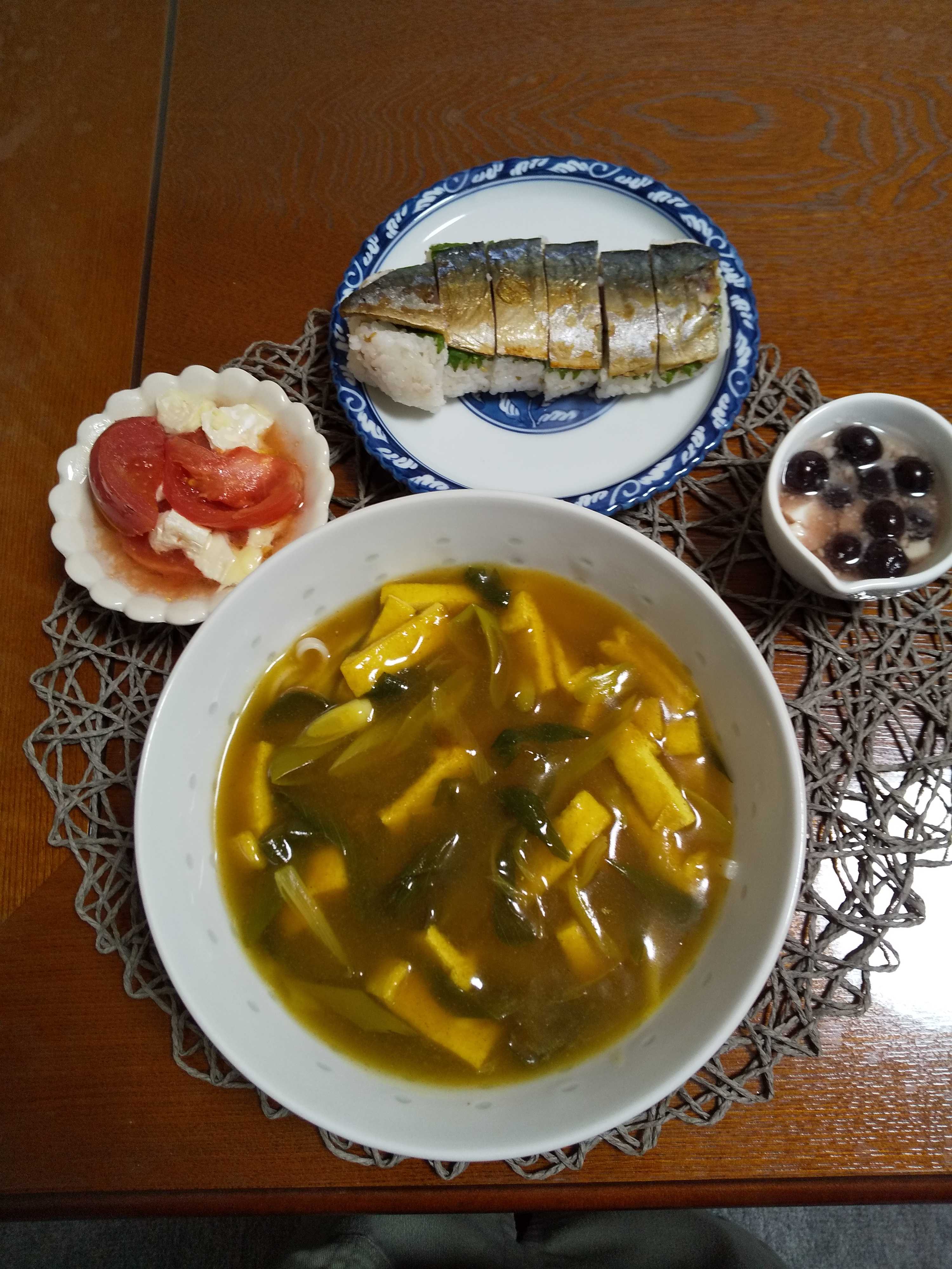 今日の夕飯です。 九条ネギが買えたので狐カレーうどんを作りました。 きつねカレーうどん 焼き鯖寿司 トマトとカマンベールチーズサラダ ブルーベリーヨーグルト