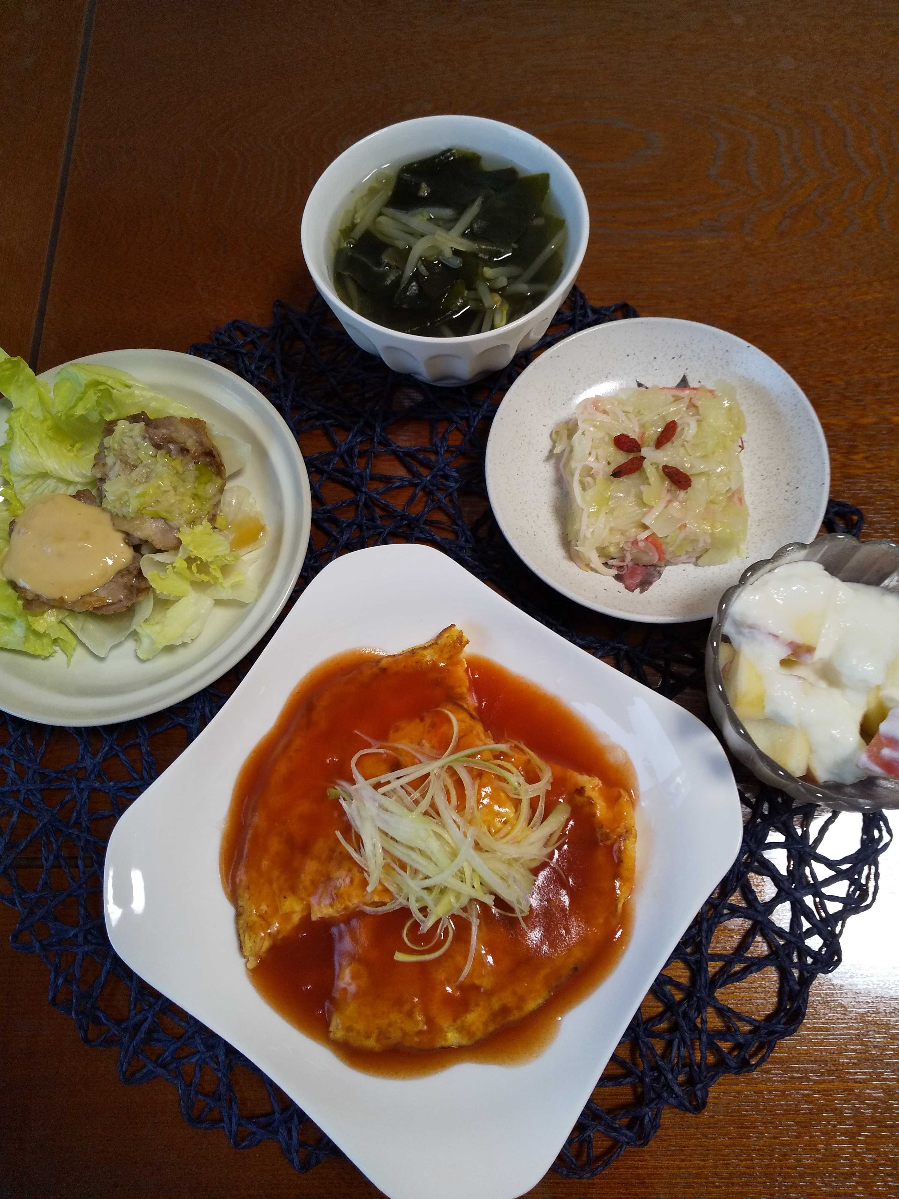 今日の夕飯です。 カニカマと絹ごし豆腐と葱と卵と鶏がらスープの素を混ぜ合わせて ごま油で焼きトマトケチャップと酢と砂糖と鶏ガラスープと塩と コショウと水溶き片栗粉で餡を作りかけて白髪ねぎをのせて頂きました。 なんちゃってかに玉 二色重ね焼き豚 野菜畑しょうがあえ りんごヨーグルト わかめともやしの味噌汁