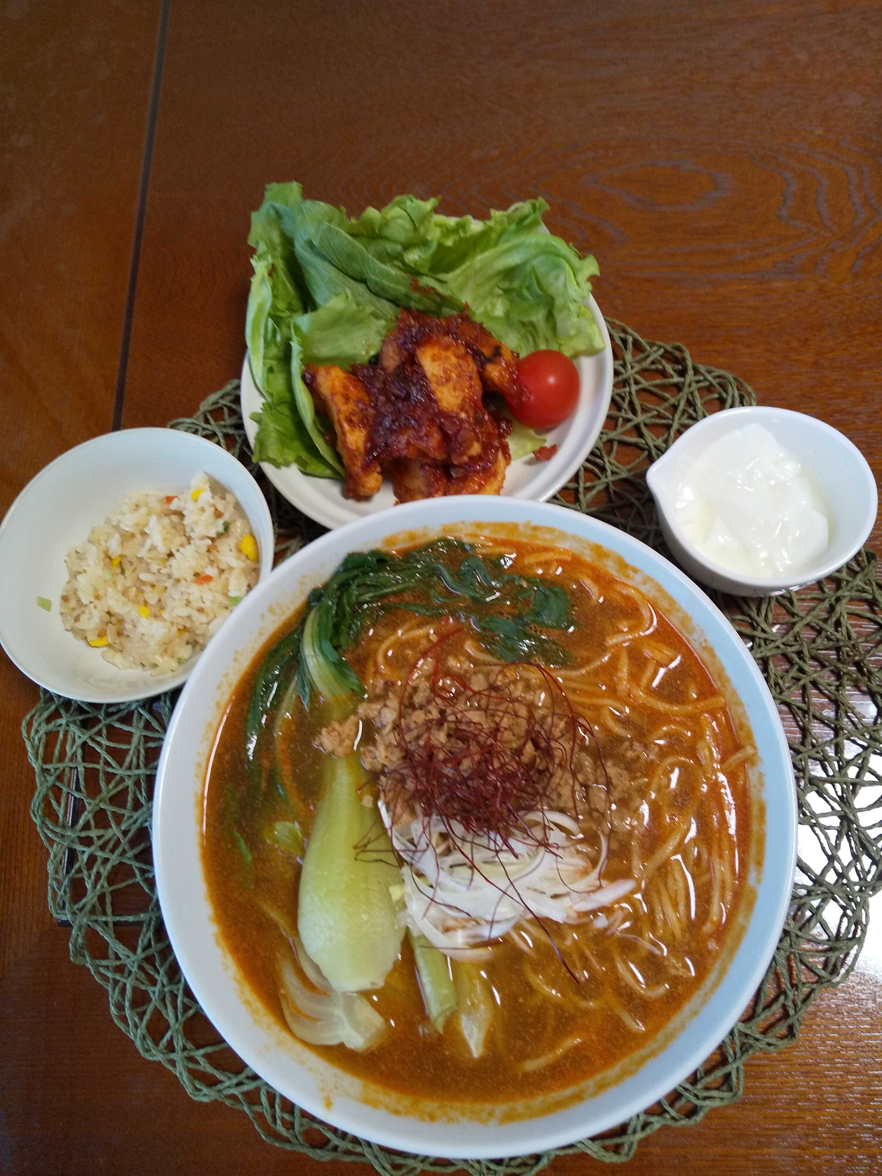 今日の夕飯です。 日清ラ王の担々麵を作りました。 副菜におからでモチモチ旨いエビチリ風を作りました。 担々麵 おからでモチモチ旨いエビチリ風 炒飯 はちみつヨーグルト
