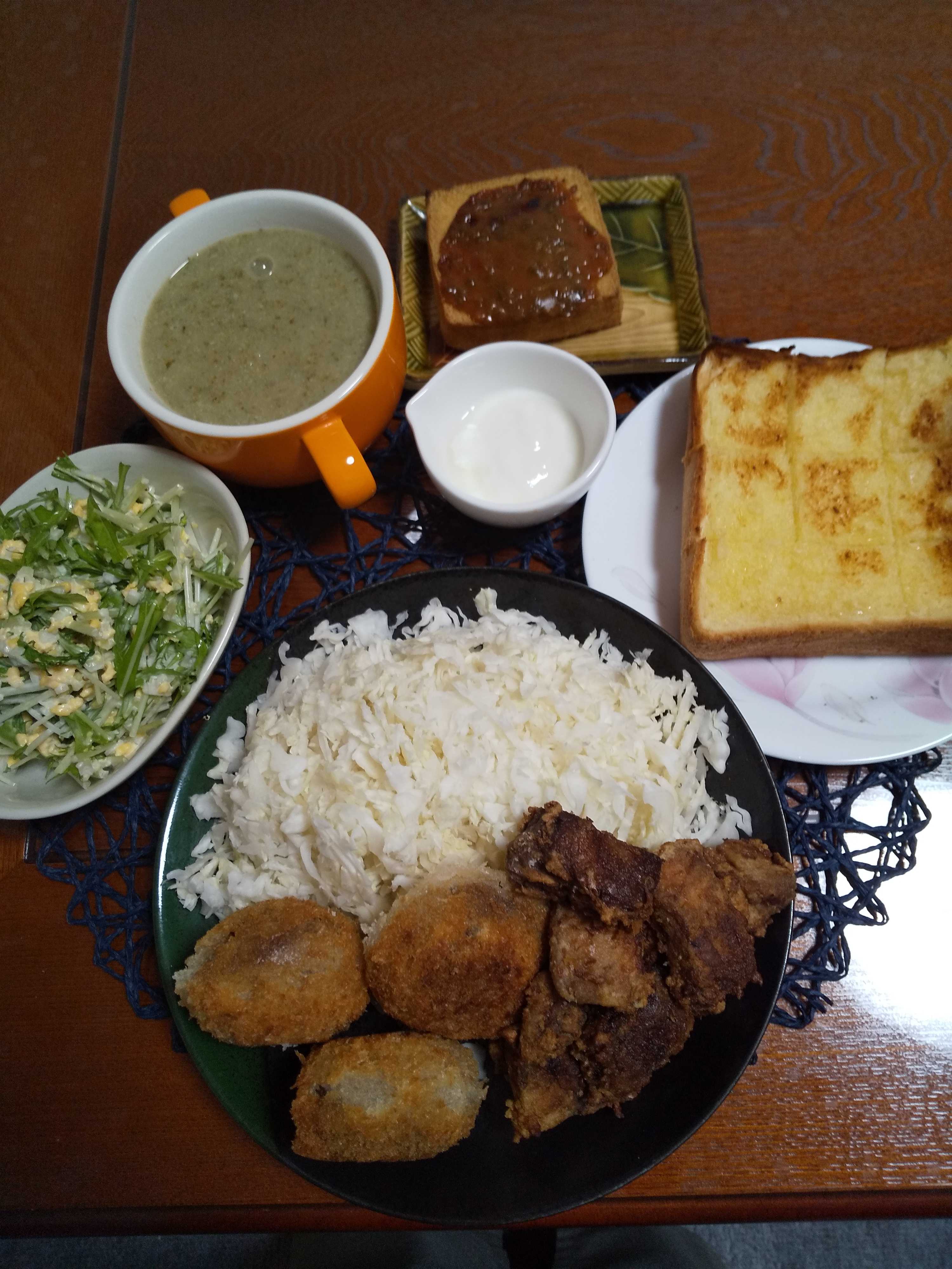 今日の夕飯です。 鮪の竜田揚げと椎茸の肉詰めフライを作りました。 鮪の竜田揚げと椎茸の肉詰めフライ 絹厚揚げねぎ味噌焼き 水菜サラダのタルタルサラダ ガーリックトースト はちみつヨーグルト 何でもスープ