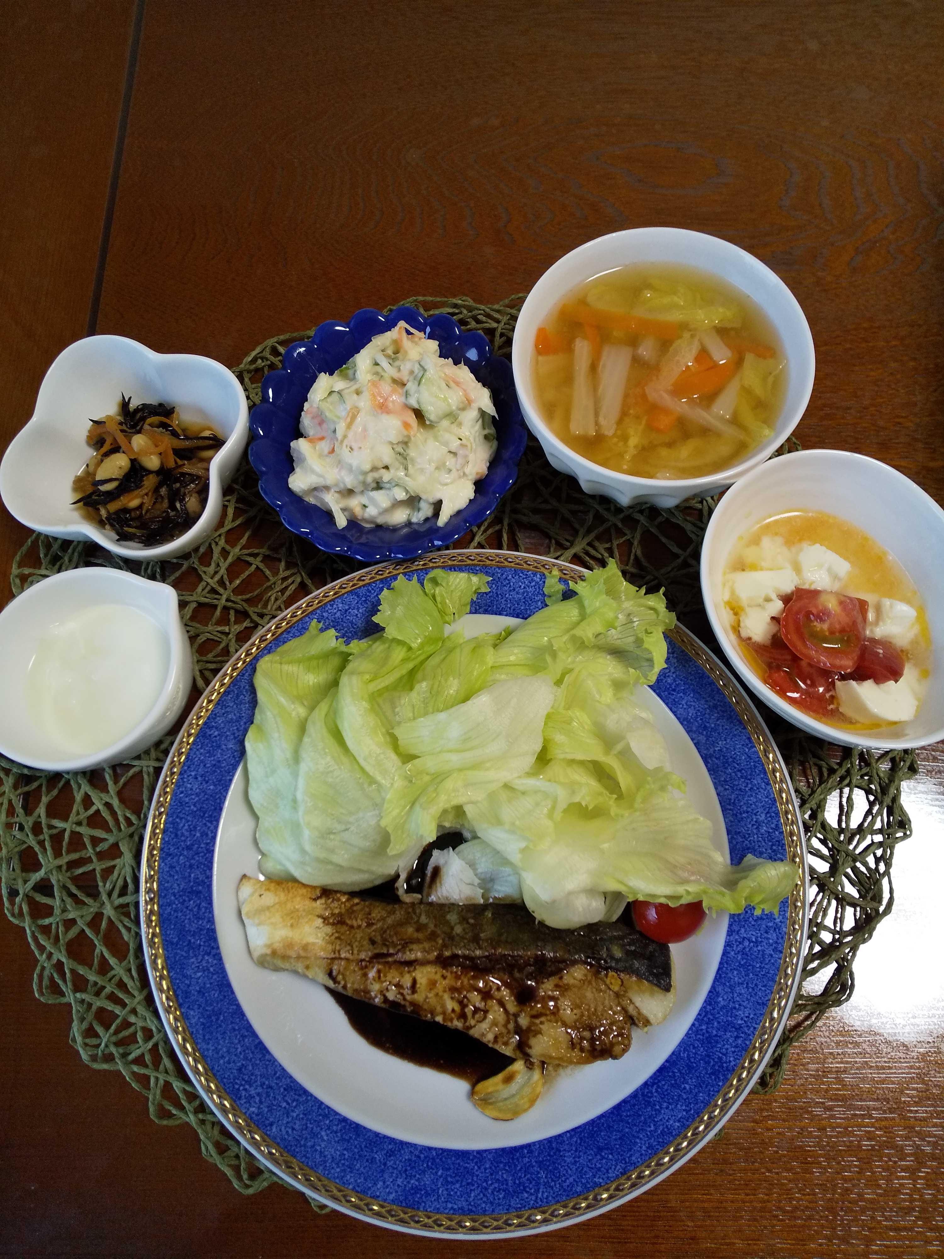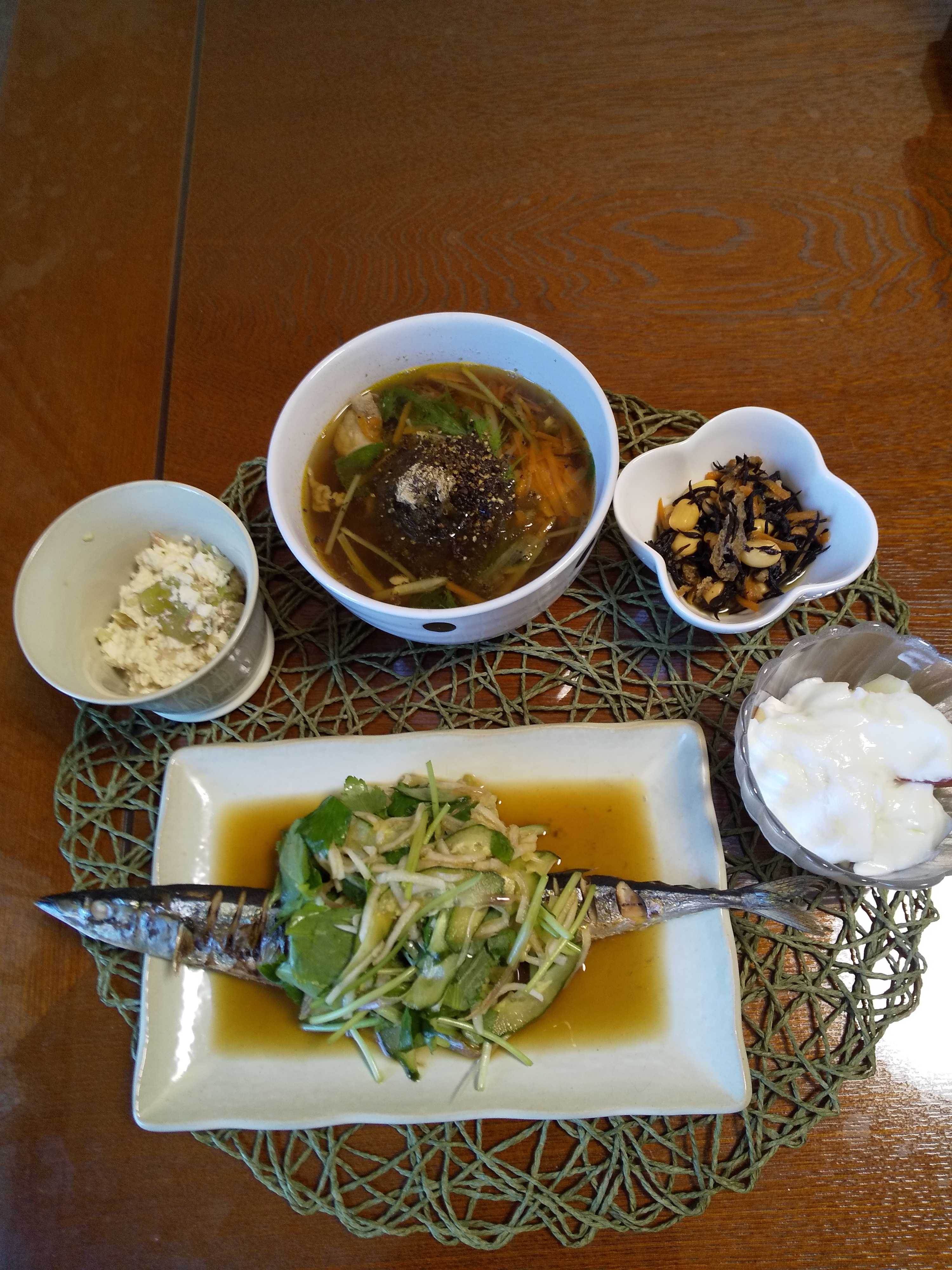 今日の夕飯です。 「斎藤辰夫さん 塩焼きさんまのアチャラ野菜添え」を作りました。 「田村隆さん 根ブー椀」を作りました。 塩焼きさんまのアチャラ野菜添え ひじきの煮物 蒸し茄子と茗荷の白和え りんごヨーグルト 根ブー椀