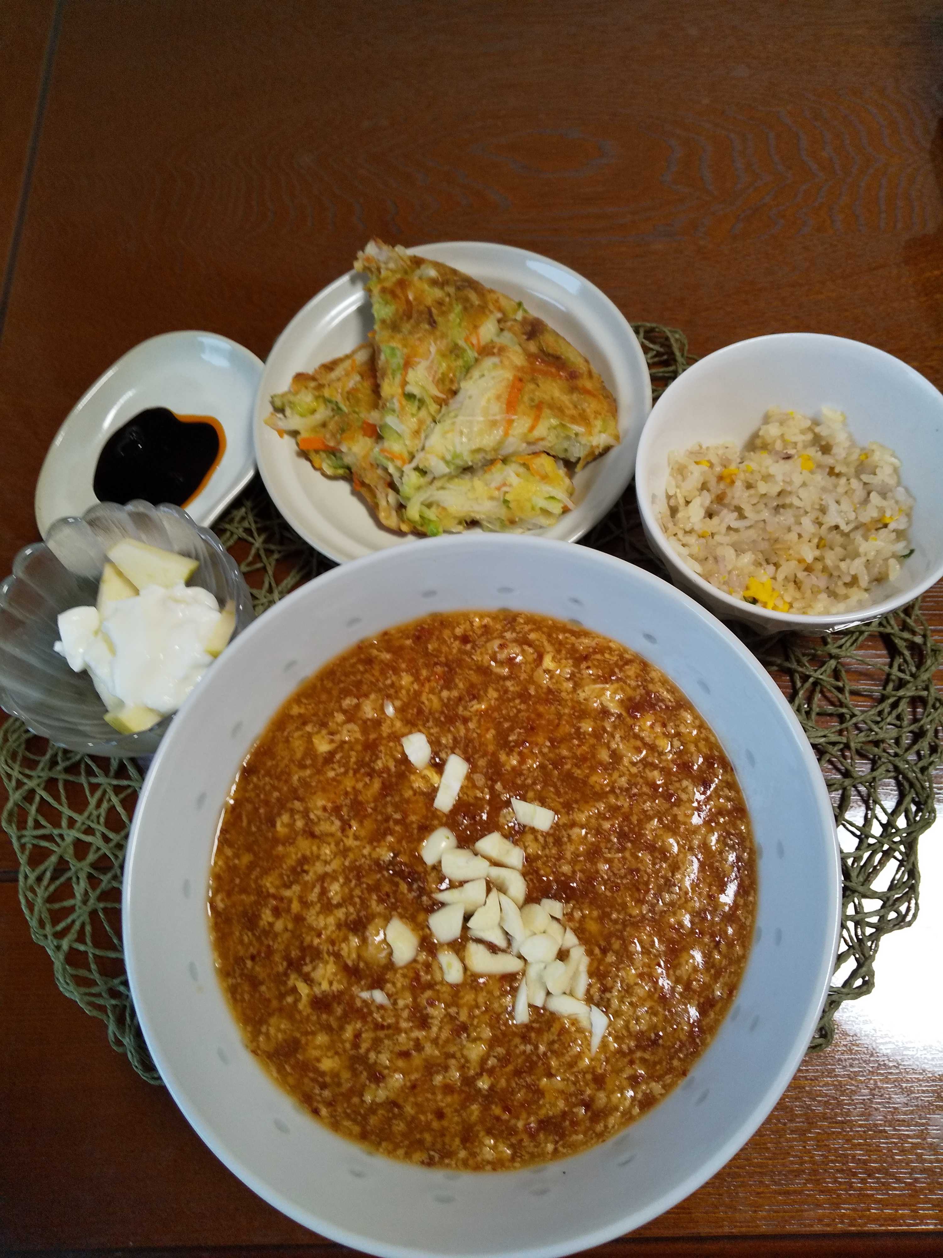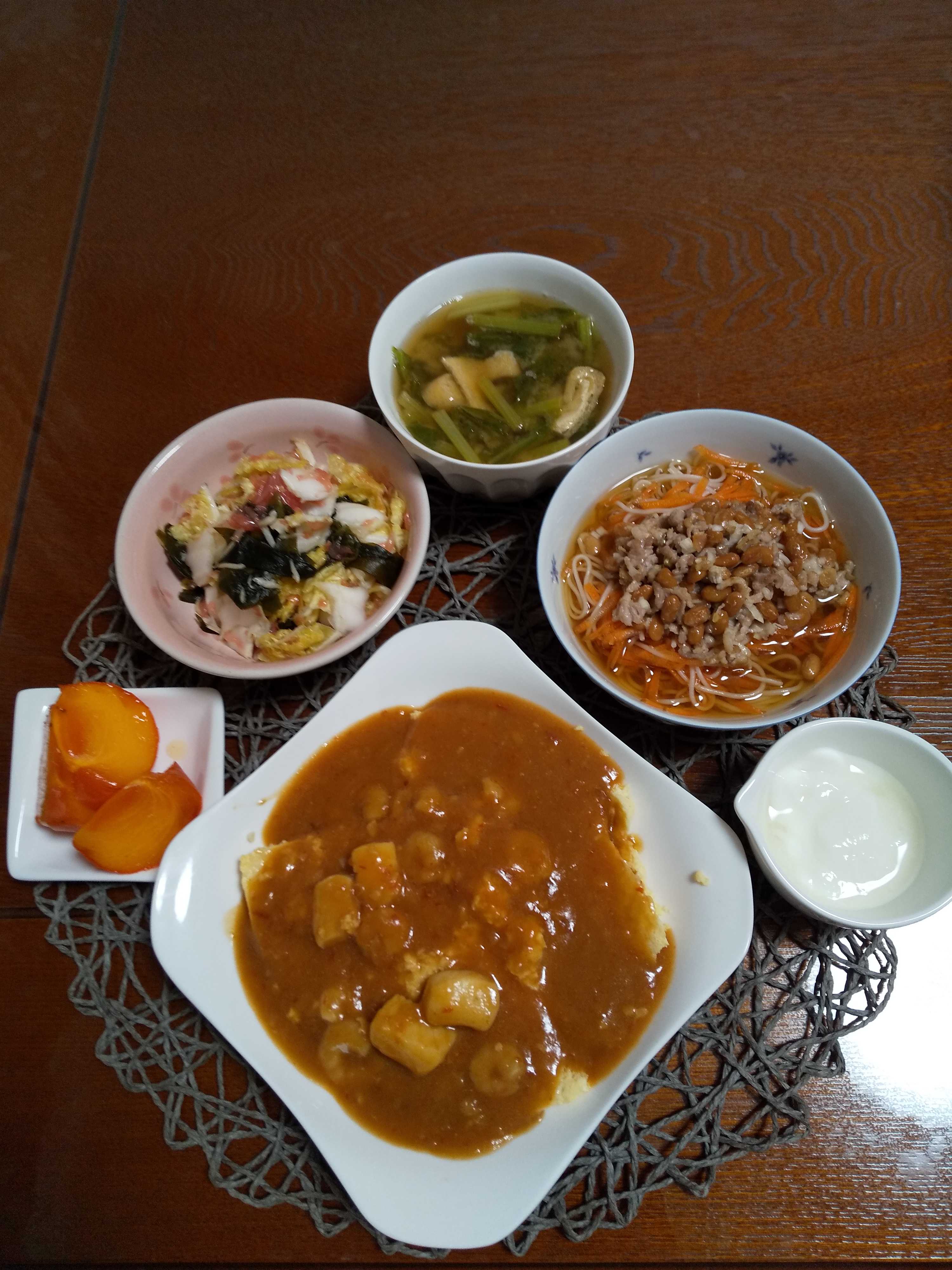 今日の夕飯です。 絹ごし豆腐とおからと卵と胡椒をボウルに入れ泡だて器よく混ぜ 耐熱皿に平らに入れふんわりラップをかけレンジで5分加熱する。 豆板醤と醤油と味噌と砂糖と酒と鶏がらスープの素と水を混ぜ合わせる。 フライパンにごま油とみじん切り大蒜を炒め香りだが立ったらシーフードを 加え炒め混ぜ合わせた調味料を加え一煮立ったら水溶き片栗粉でとろみをつけ 器に加熱した蒸し豆腐を盛りあんをかける。 蒸し豆腐のマーボーあんかけ 甘酢ごちそうめん 白菜とグレープフルーツの酢の物 柿 はちみつヨーグルト かき菜と油揚げの味噌汁